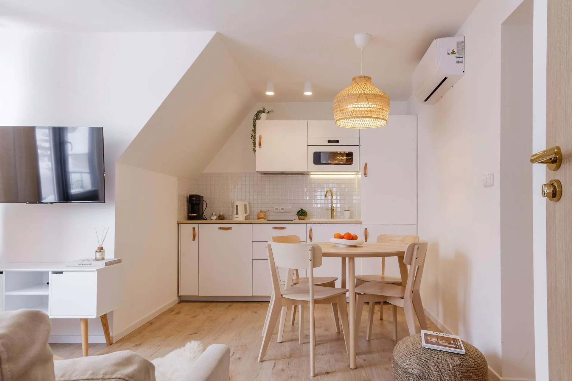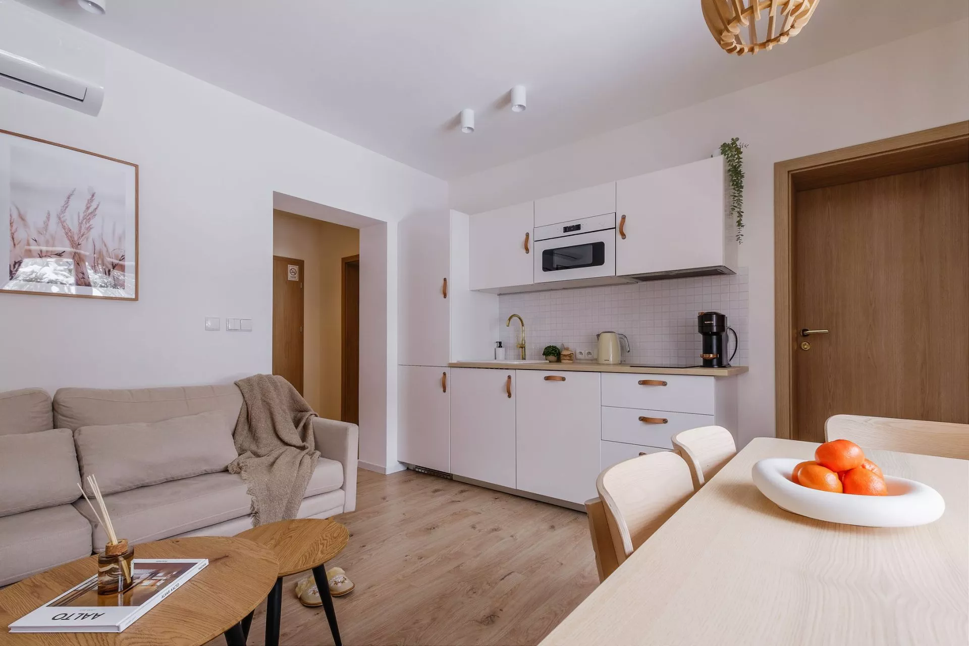 Salon: sofa, stół, 2 krzesła, klimatyzacja, wanna