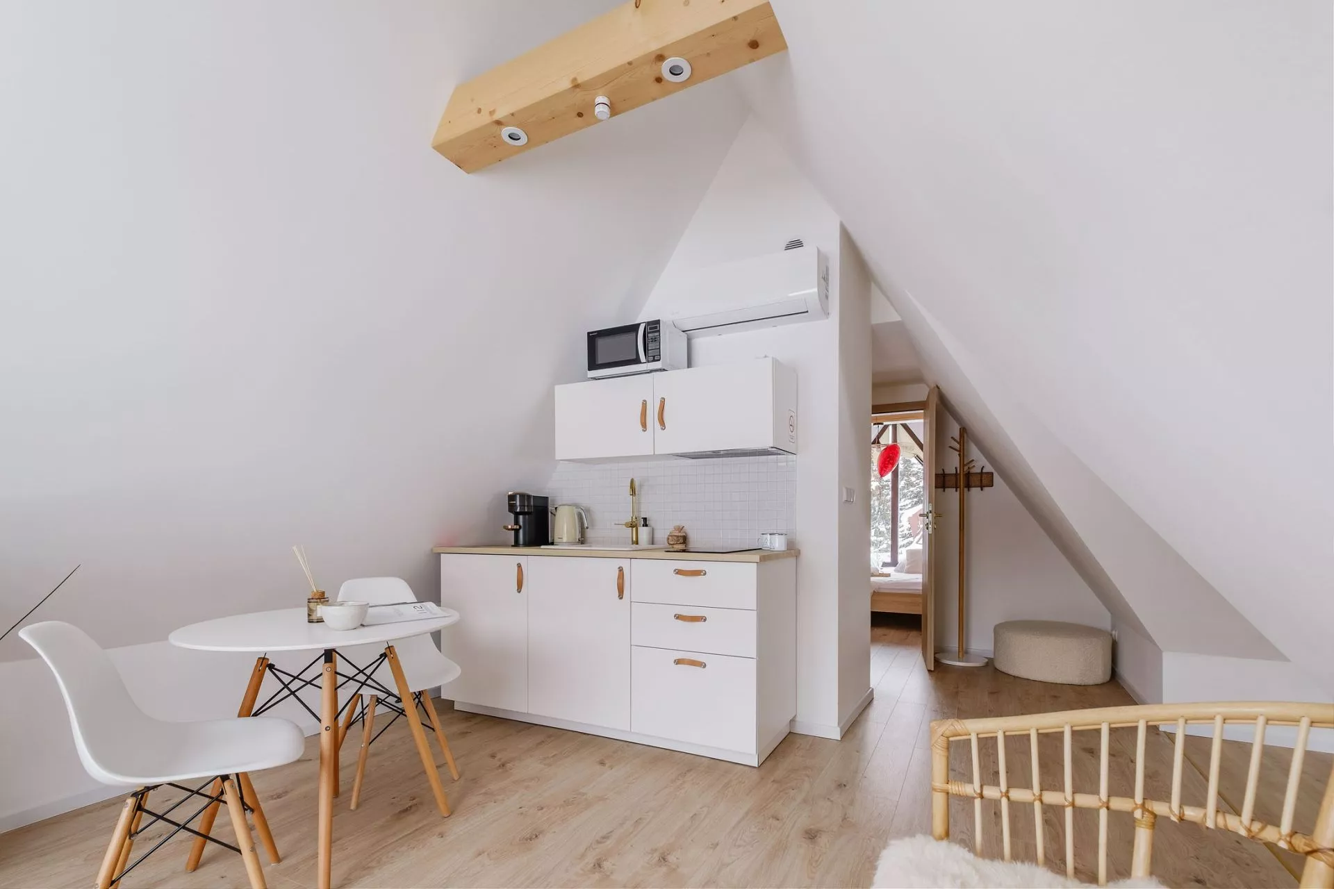 Aneks kuchenny: 2 palnikowa płyta elektryczna, lodówka, kuchenka mikrofalowa, czajnik elektryczny, ekspres do kawy, naczynia, sztućce, zastawa szklana