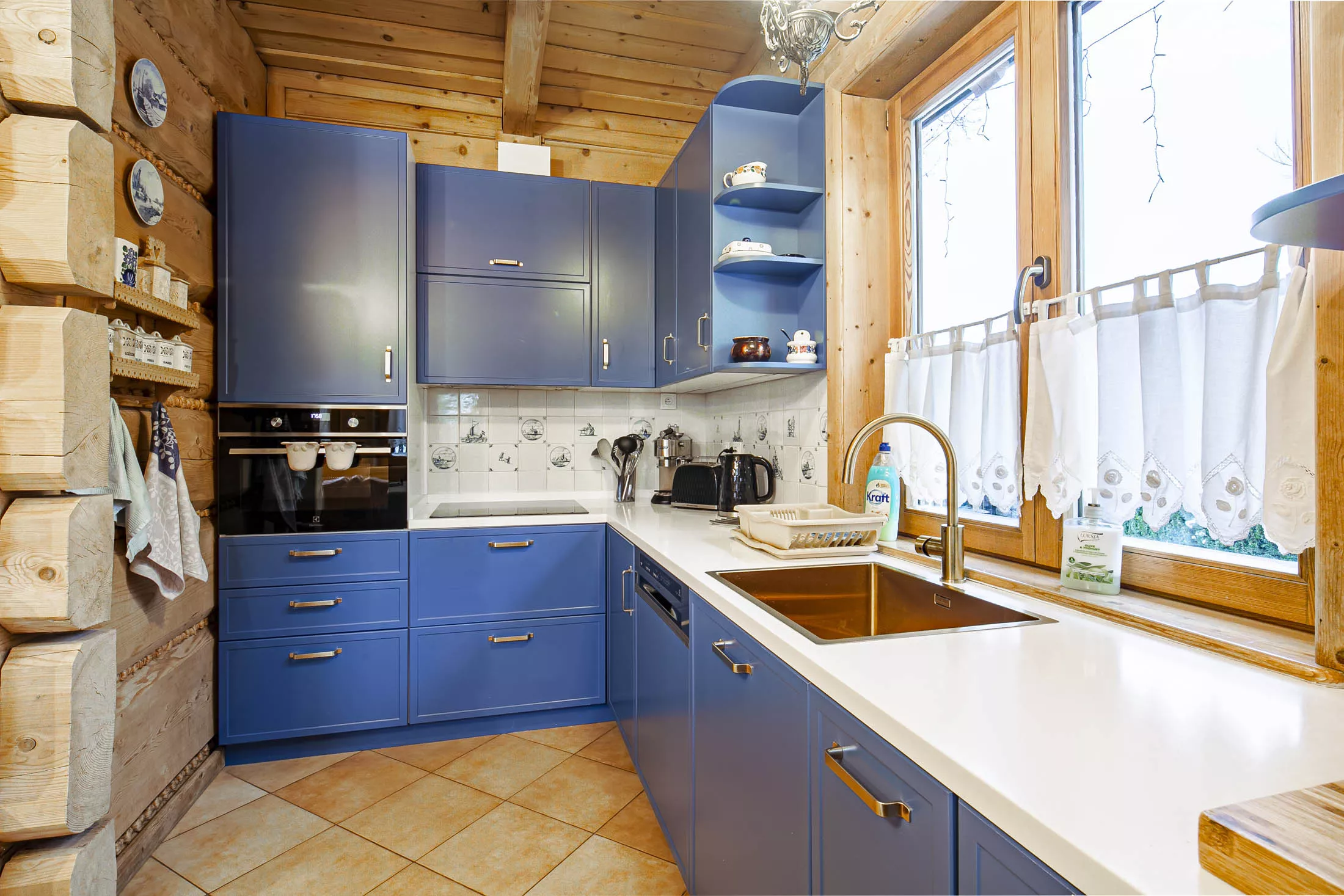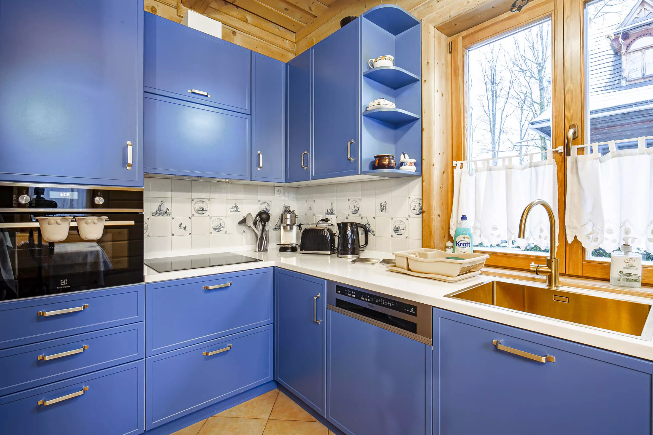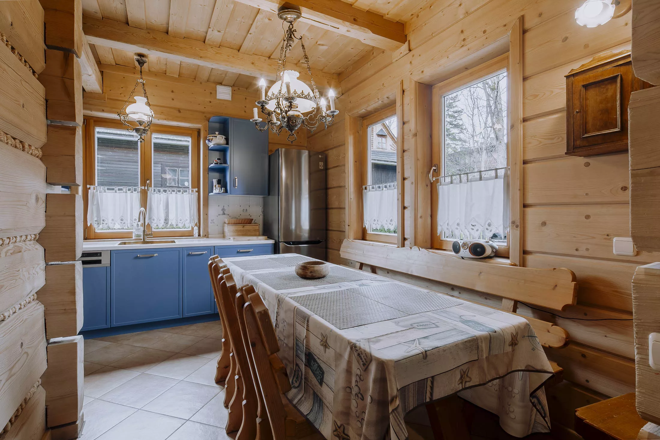 Kuchnia: kuchenka indukcyjna, piekarnik z funkcją mikrofali, duża lodówka, zmywarka, ekspres do kawy ciśnieniowy, toster, czajnik bezprzewodowy, sztućce, talerze, garnki, szkło; długi stół, ława i 4 krzesła