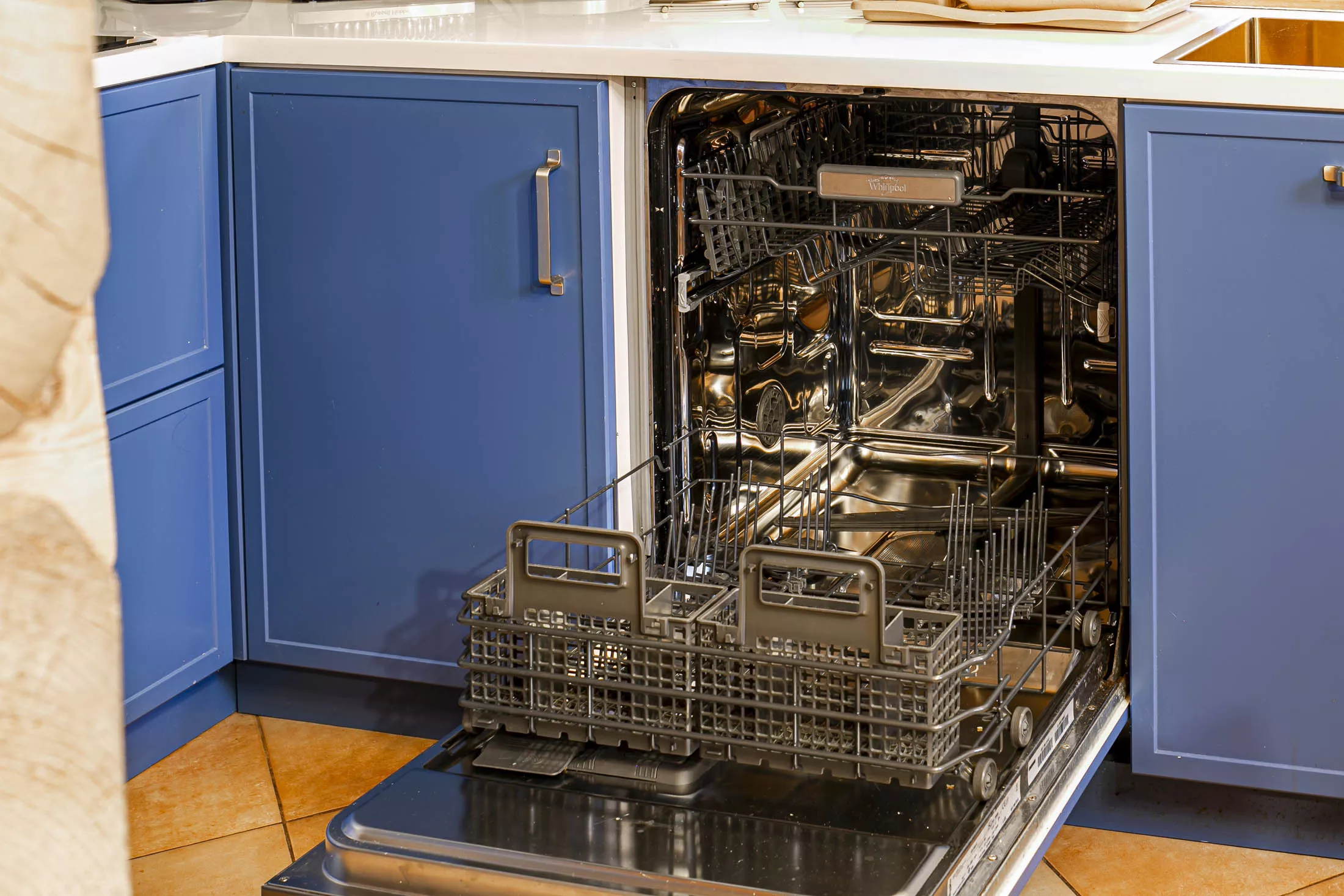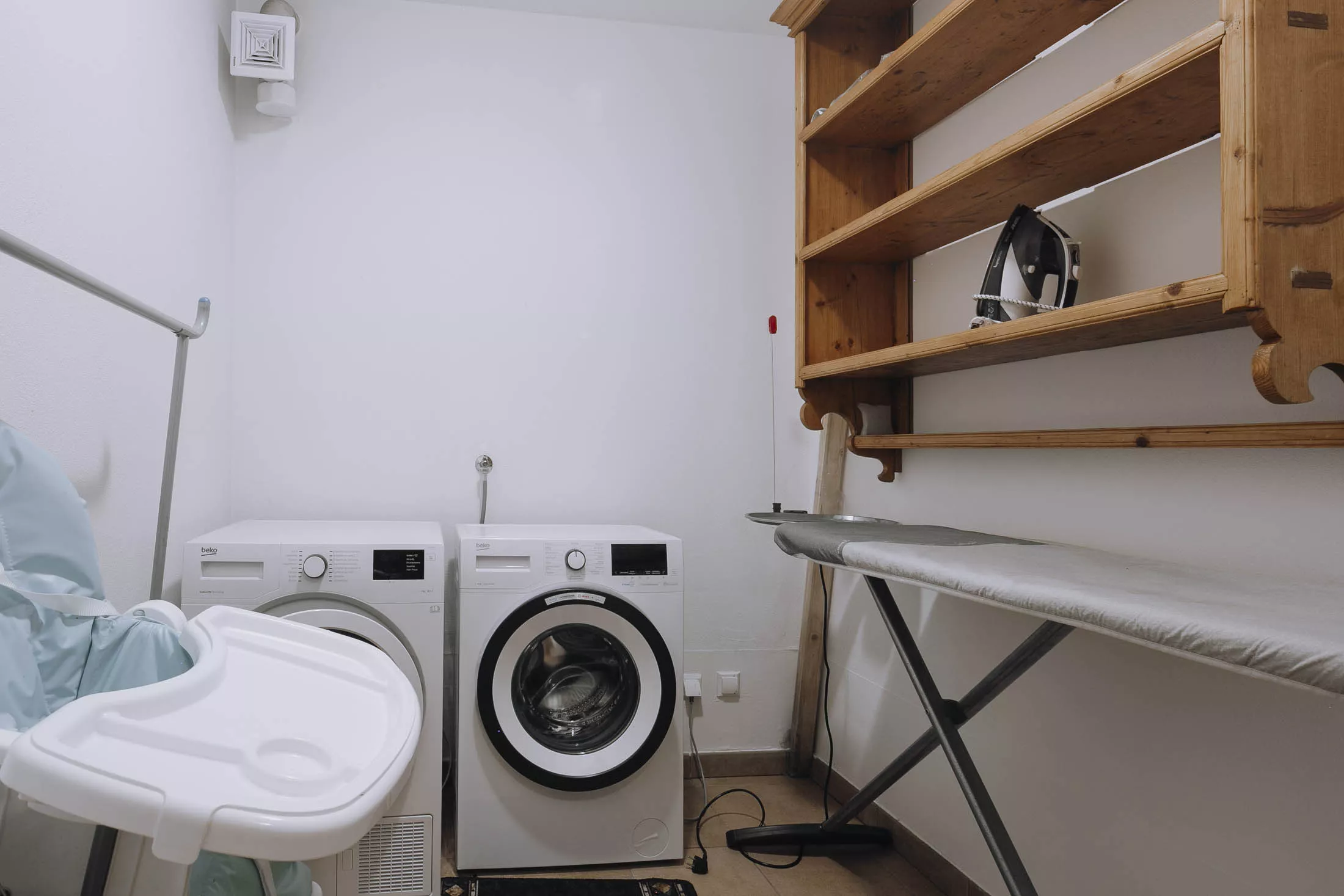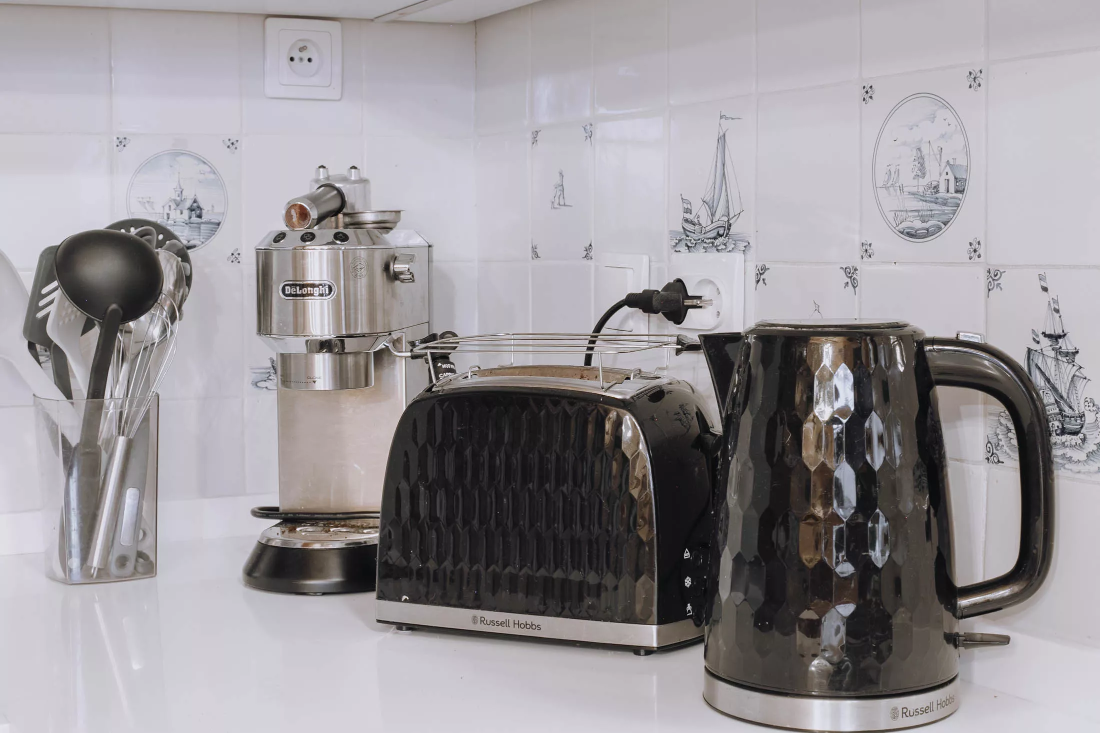 Kuchnia: kuchenka indukcyjna, piekarnik z funkcją mikrofali, duża lodówka, zmywarka, ekspres do kawy ciśnieniowy, toster, czajnik bezprzewodowy, sztućce, talerze, garnki, szkło; długi stół, ława i 4 krzesła