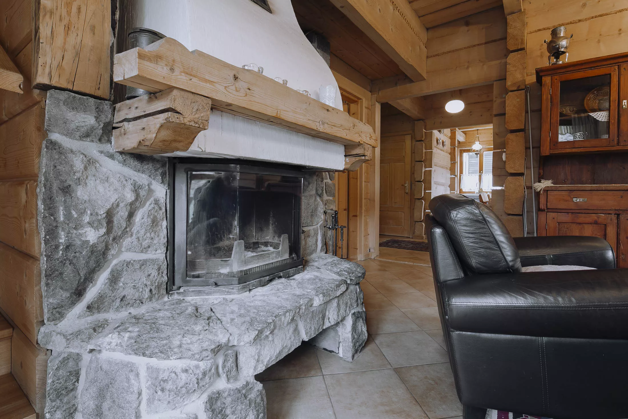 Salon: sofa, kanapa narożna, stolik, kredens w stylu góralskim, fotel, stolik, szafka i TV, kominek