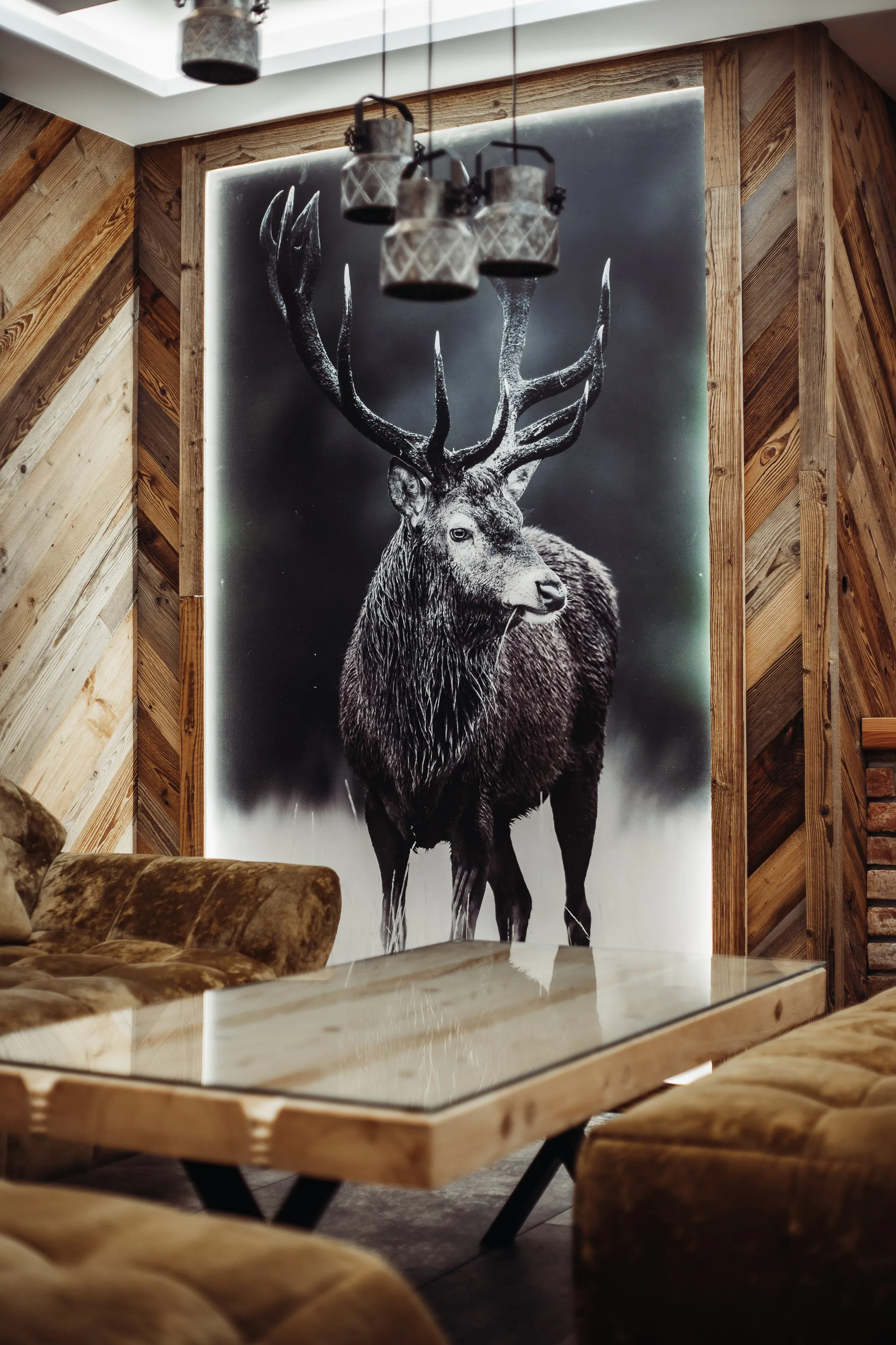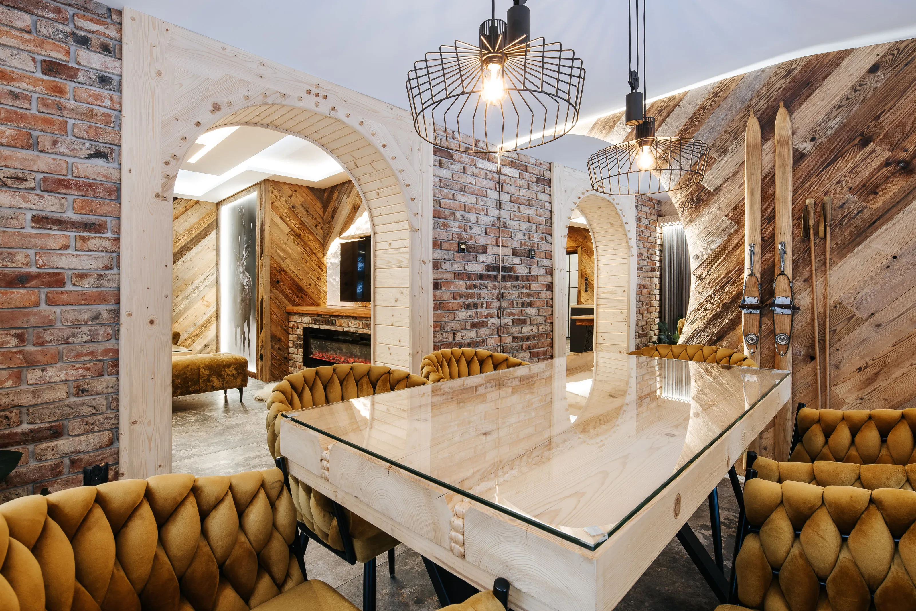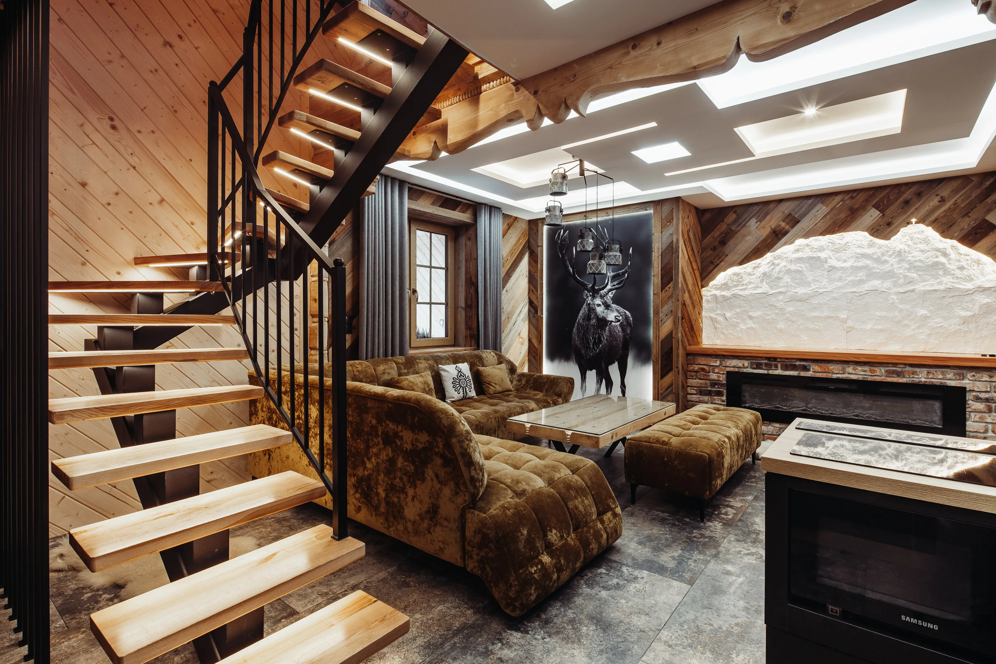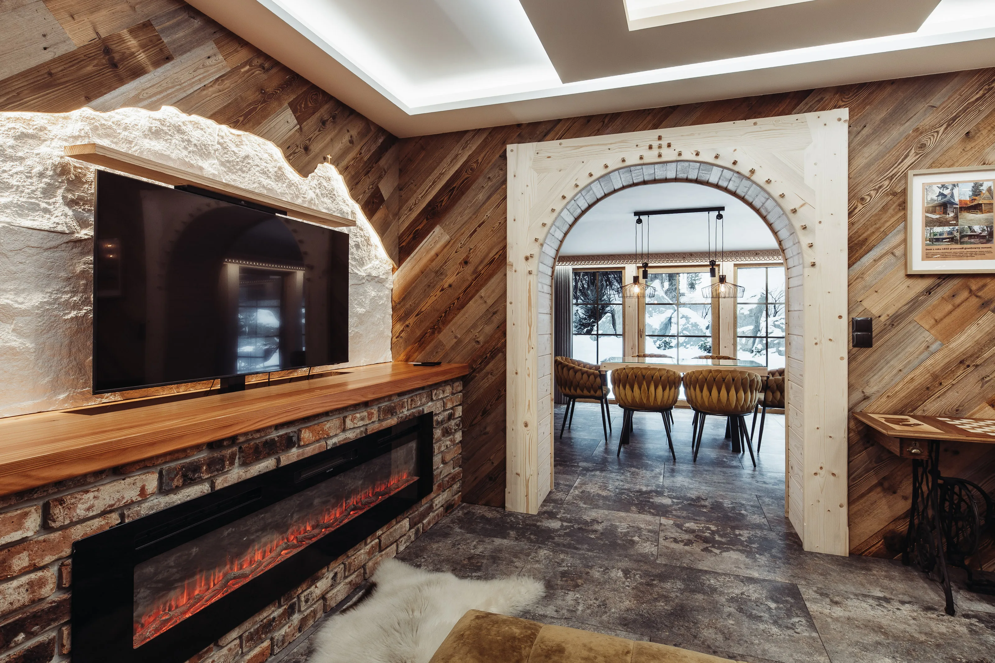 Salon: duży (nie rozkładany - bez funkcji spania) narożnik wypoczynkowy, puffa, stolik, TV LCD 45' (automatycznie wysuwany), kominek elektryczny. W części jadalnianej - duży stół + 6 foteli