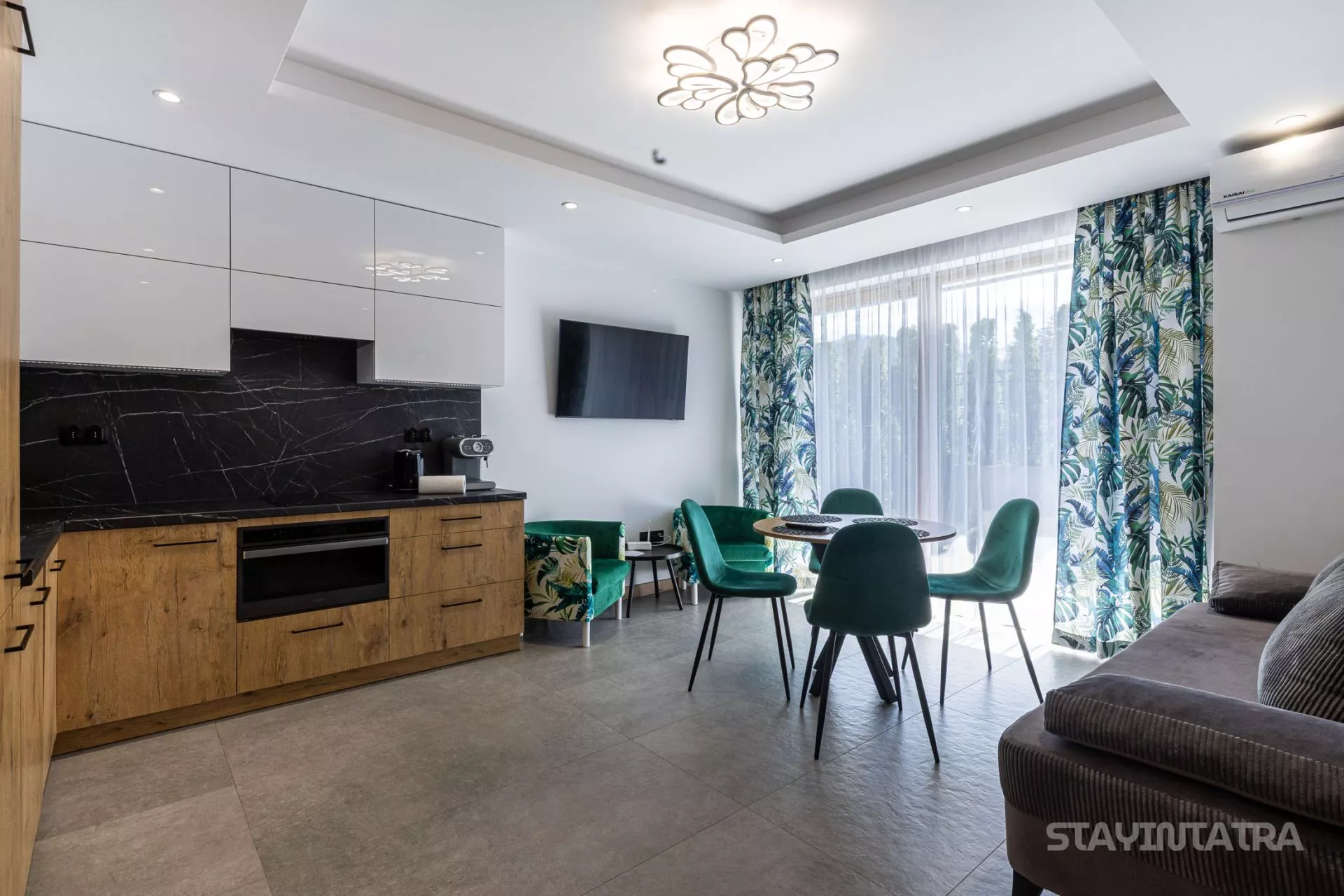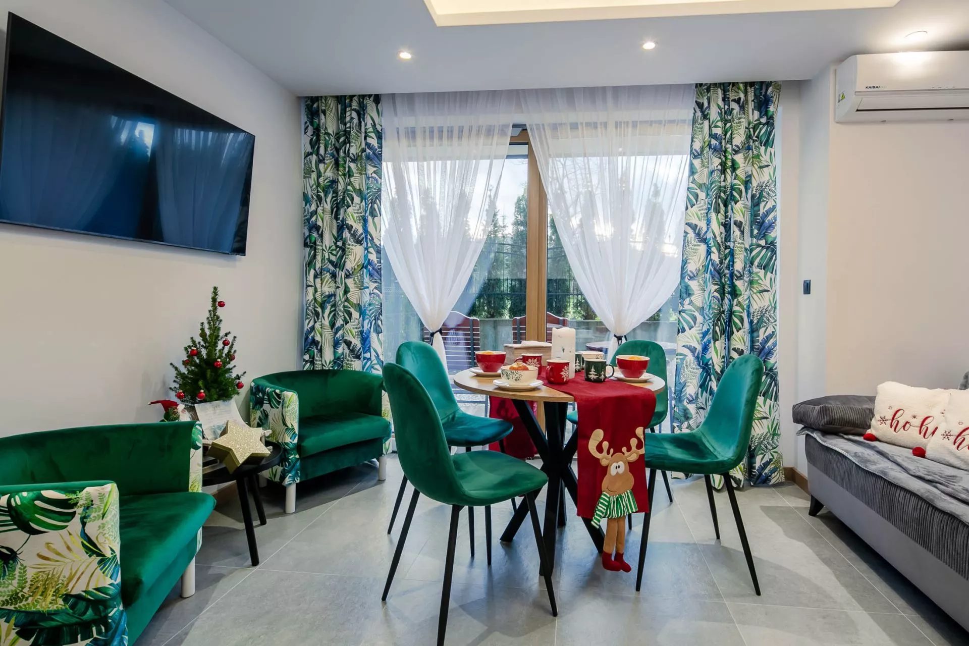 Salon: 2 osobowa sofa, duży okrągły stół, 4 krzesła, 2 fotele, stolik kawowy, TV'43, klimatyzacja. Z salonu znajduje się bezpośredni wyjście do prywatnego ogródka.