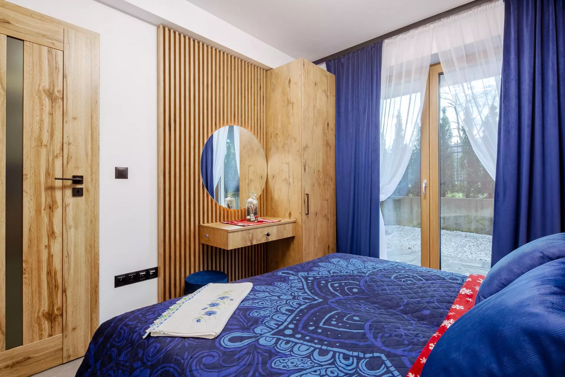Sypialnia 1 - łóżko małżeńskie, szafa, wyjście do prywatnego ogródka