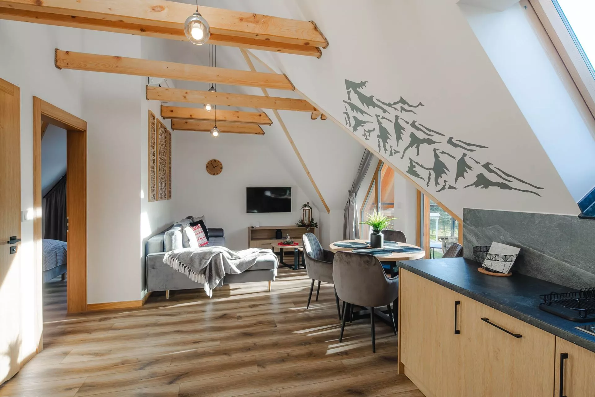 Salon - 2 osobowa rozkładana sofa, szafka typu rtv, TV'45, stolik kawowy, balkon z widokiem na Tatry z meblami ogrodowymi, okrągły stół i 4 krzesła, klimatyzacja.