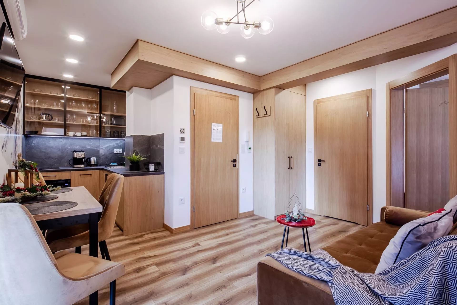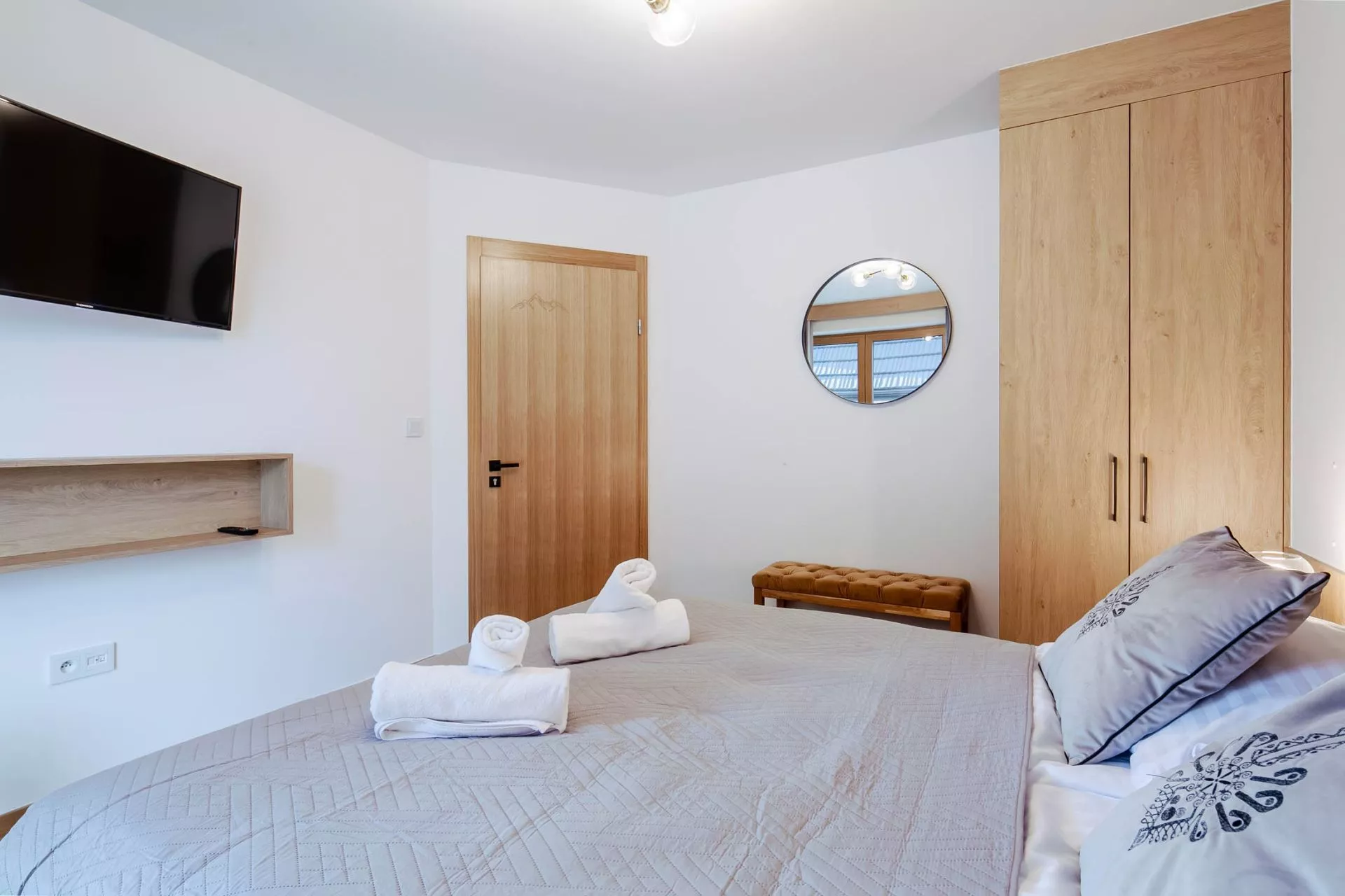 Salon: 2 osobowa rozkładana sofa, stolik kawowy, stół, 3 krzesła, TV'45, wyjście na balkon z pięknym widokiem na panoramę Tatr z meblami ogrodowymi, szafa, klimatyzacja.