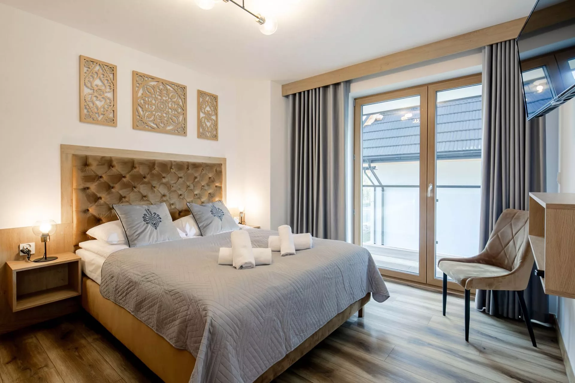 Sypialnia 1 - 2 łóżka pojedyncze, przy łóżku znajdują się gniazda elektrycznej, komoda, balkon z widokiem na Tatry