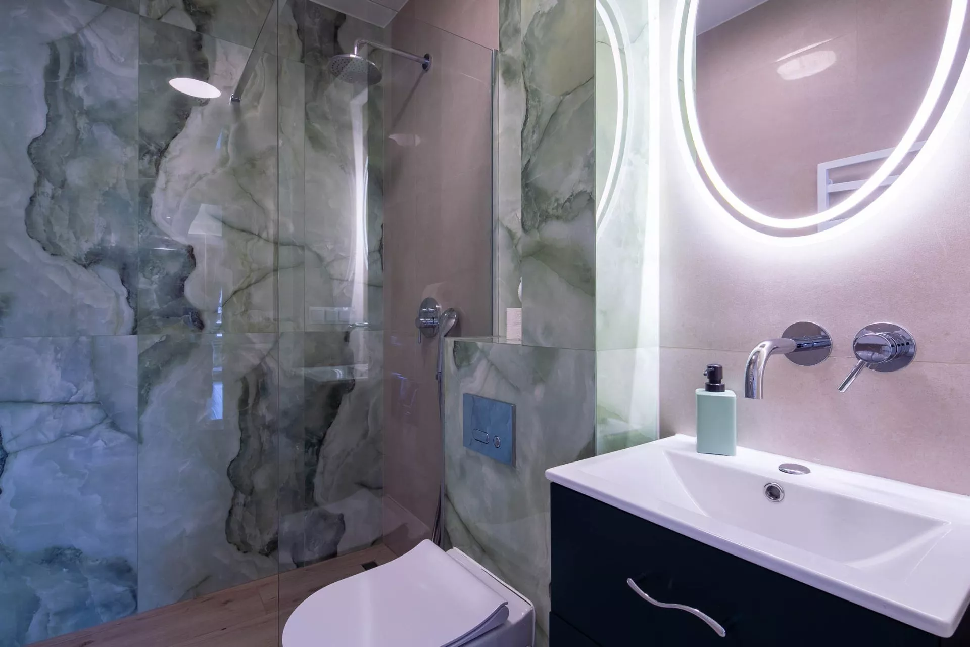 Łazienka: prysznic, toaleta, umywalka, lustro, grzejnik ręczników