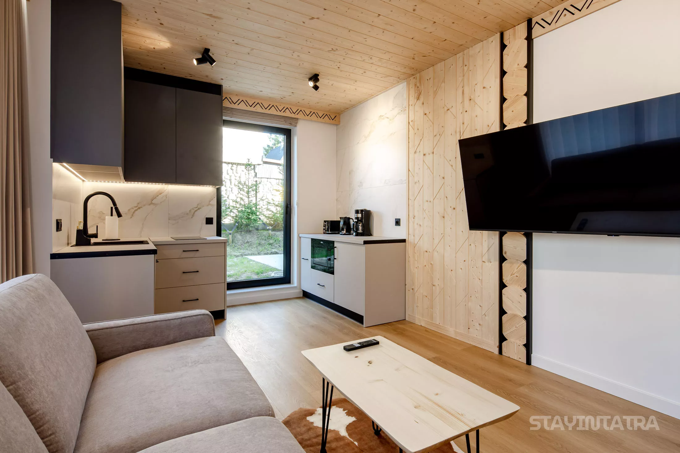 Salon: rozkładana sofa, stolik kawowy, telewizor, fotel, klimatyzacja, wyjście na taras