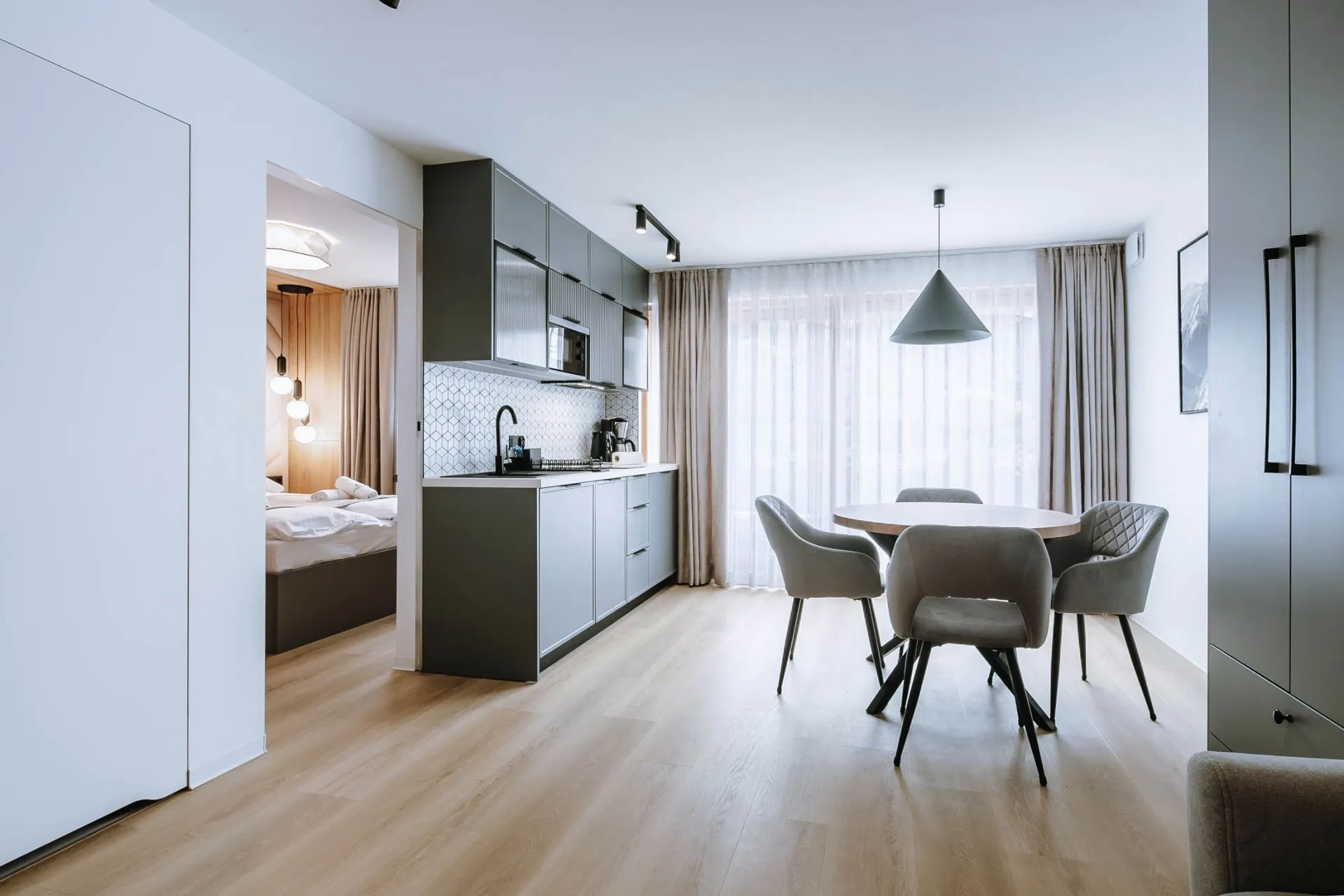 Struktura apartamentu: Salon z aneksem kuchennym i wyjściem do prywatnego ogródka, zamykana sypialnia, łazienka