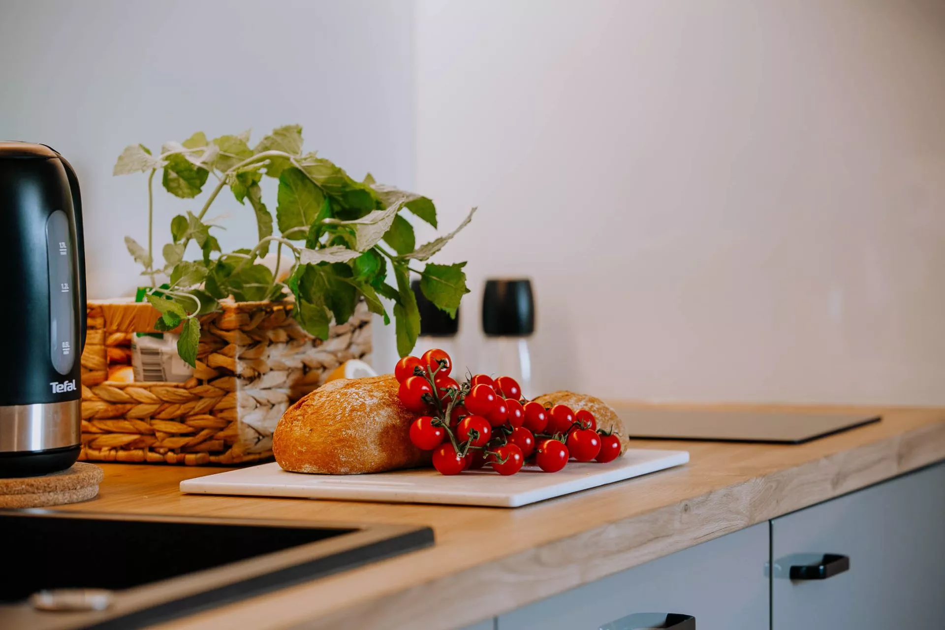 Aneks kuchenny: czajnik elektryczny, ekspres do kawy (kolbowy), lodówka, zmywarka, 2 palnikowa płyta elektryczna, kuchenka mikrofalowa, komplet naczyń i sztućców, zastawa szklana