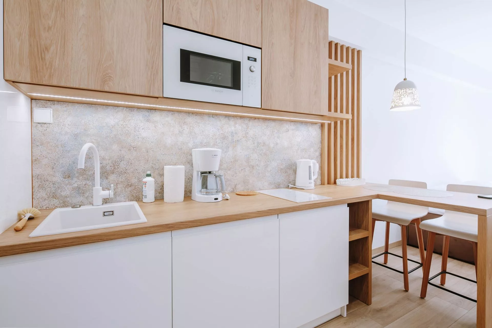 Aneks kuchenny: 2 palnikowa płyta elektryczna, lodówka, czajnik elektryczny, kuchenka mikrofalowa, komplet naczyń i sztućców, zastawa szklana, wysoka lada, 2 krzesła