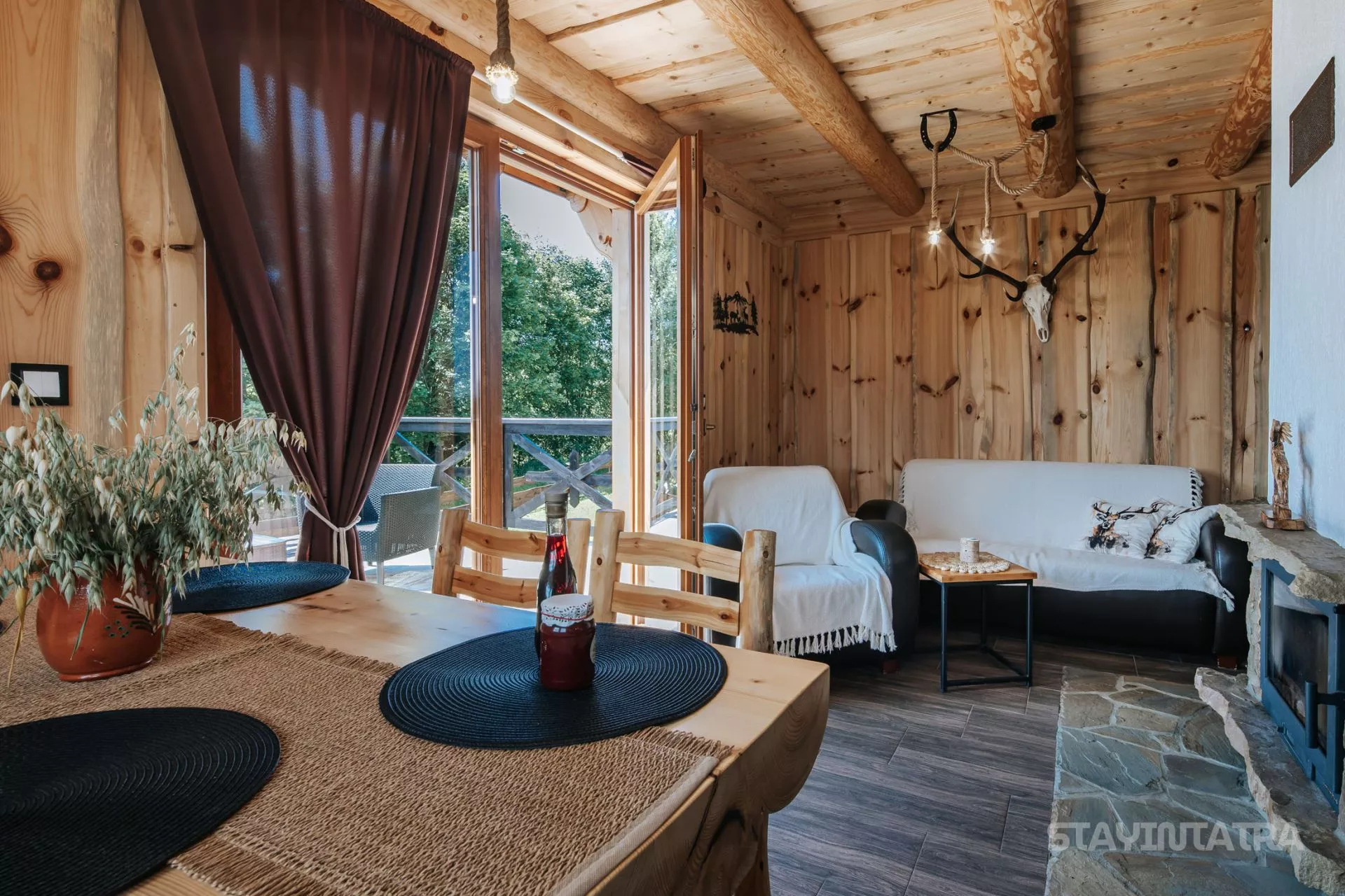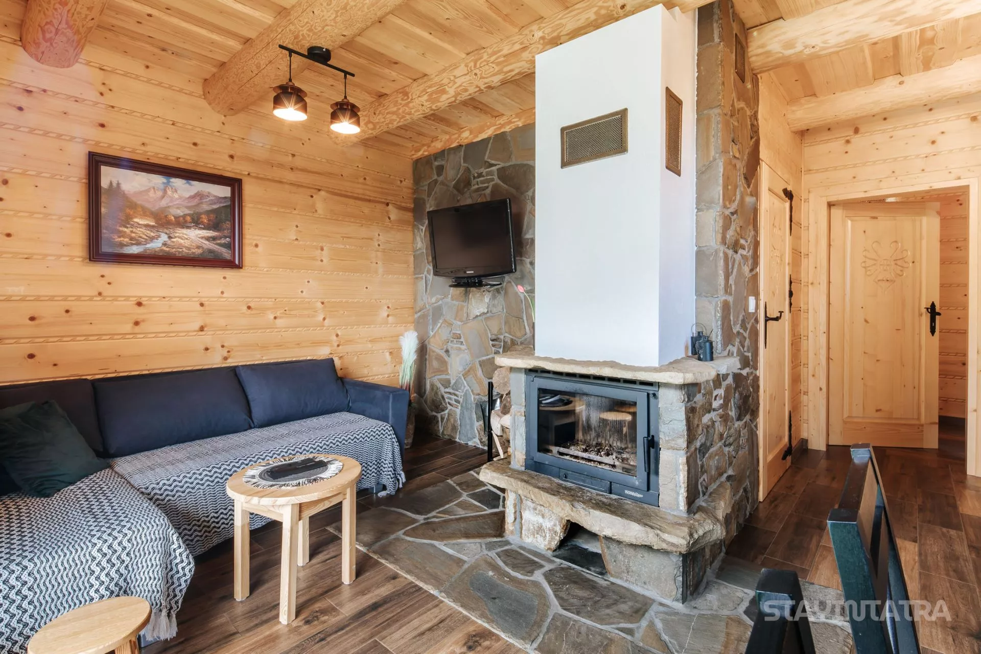 Salon: sofa do siedzenia (bez opcji spania), fotel, stolik kawowy, TV'42, prawdziwy kominek, drewno, wyjście na taras