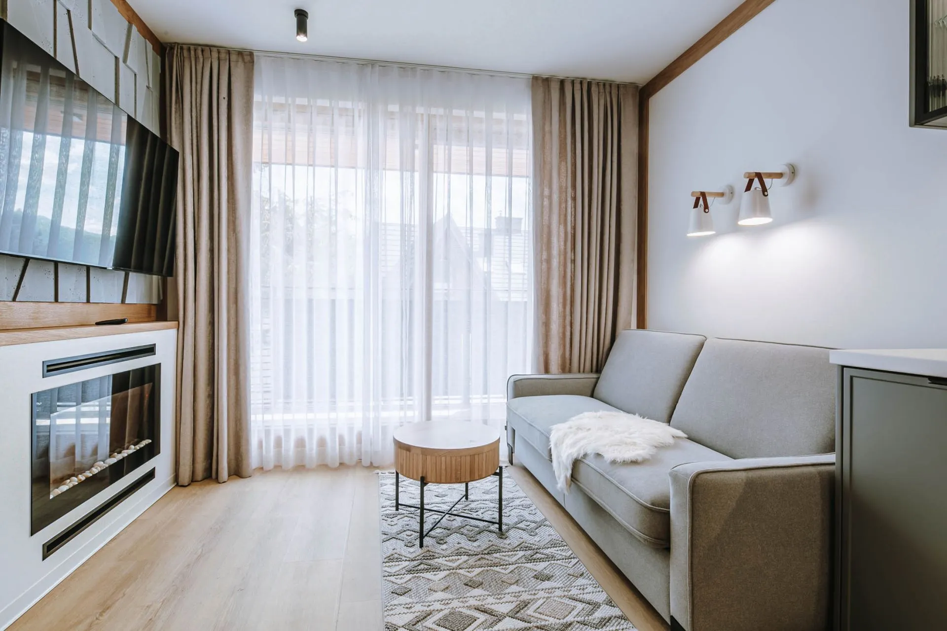 Salon: rozkładana sofa, stolik kawowy, telewizor samsung, kominek elektryczny, wyjście na balkon