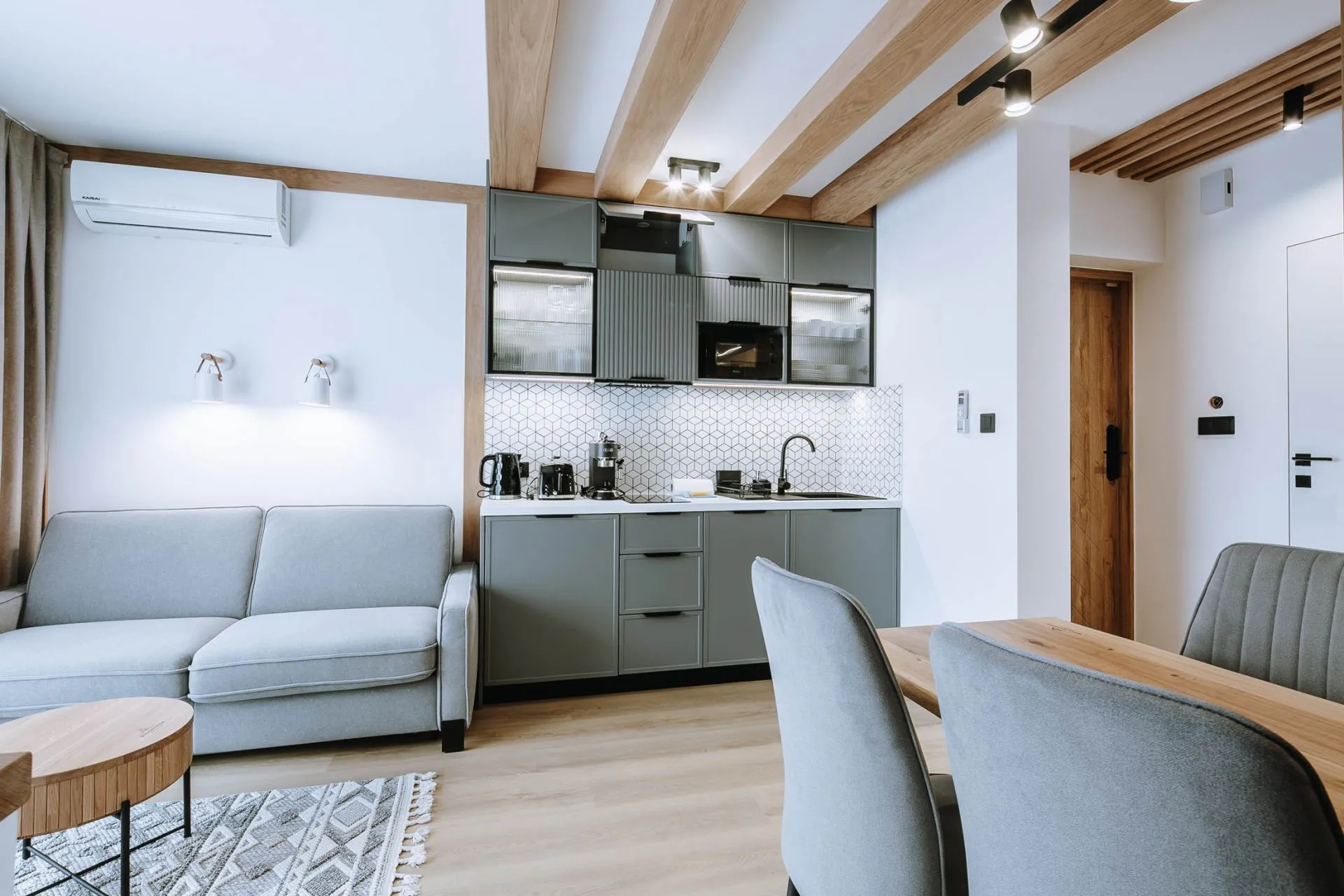 Salon: rozkładana sofa, stolik kawowy, telewizor samsung, kominek elektryczny, klimatyzacja, wyjście na balkon