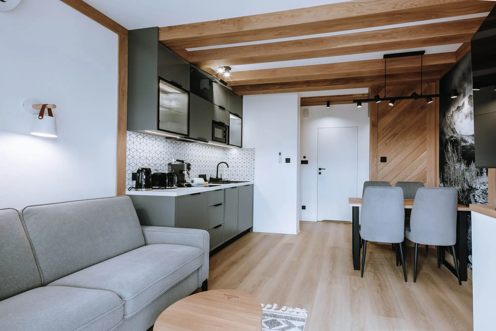 Aneks kuchenny: dwupalnikowa płyta indukcyjna, czajnik elektryczny, ekspres DeLonghi, toster, lodówka, zmywarka, mikrofalówka, zastawa ceramiczna oraz szklana, sztućce, garnki, patelnie, akcesoria do gotowania, stół z krzesłami