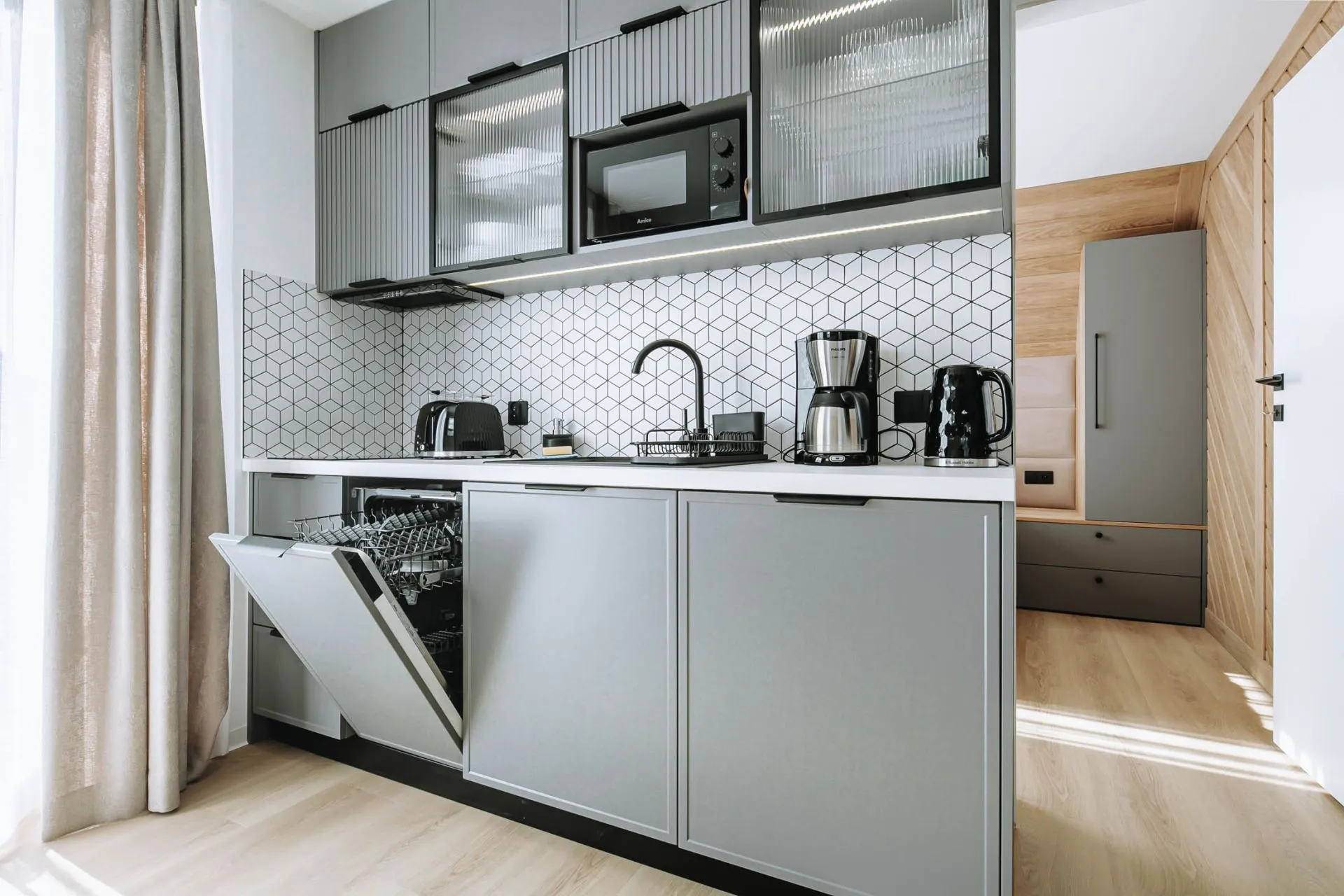 Aneks Kuchenny: dwupalnikowa płyta indukcyjna, lodówka, zmywarka, mikrofalówka, czajnik elektryczny, ekspres przelewowy Philips, toster, zlew, zastawa ceramiczna oraz szklana, garnki, patelnie, sztućce, przybory do gotowania, stół z krzesłami, wyjście na balkon z widokiem bocznym na Tatry oraz łąkę