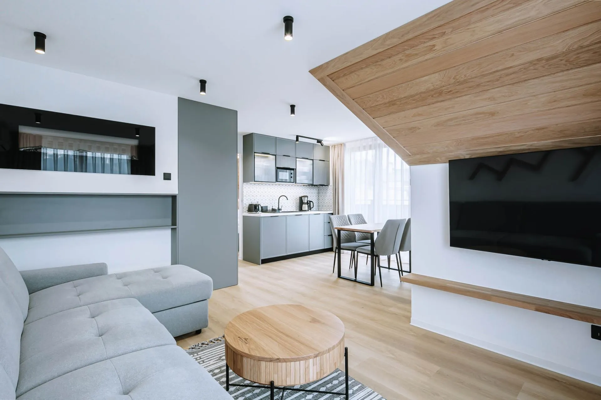 Apartamenty o wysokim standardzie w Kościelisku z przepięknym widokiem na Panoramę Tatr oraz SAUNĄ dostępną dla gości obiektu bezpłatnie. W budynku znajduje się 8 apartamentów, 4 apartamenty 6 osobowe oraz 4 apartamenty 4 osobowe, plus pralnia z której goście mogą korzystać bezpłatnie podczas swojego pobytu.