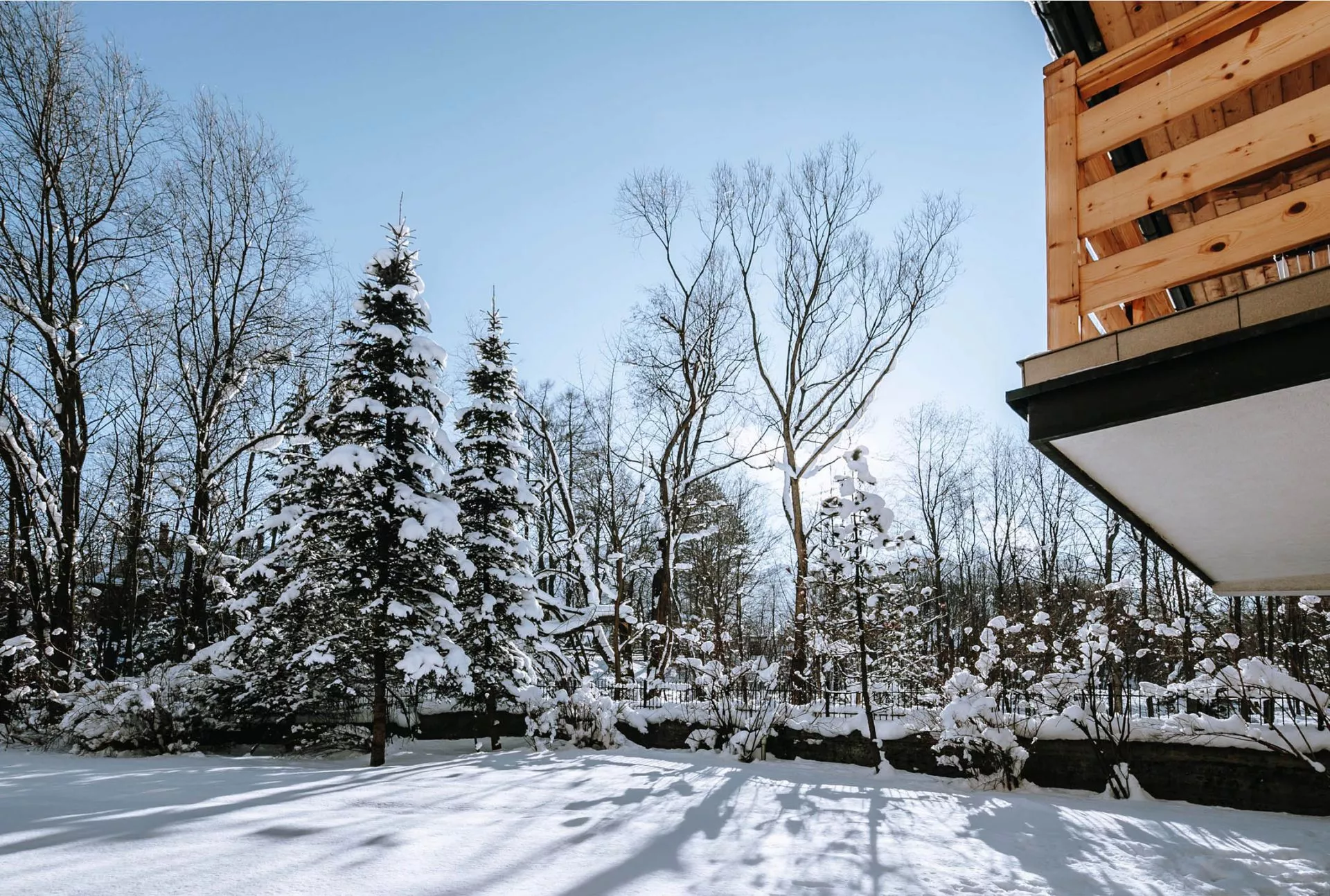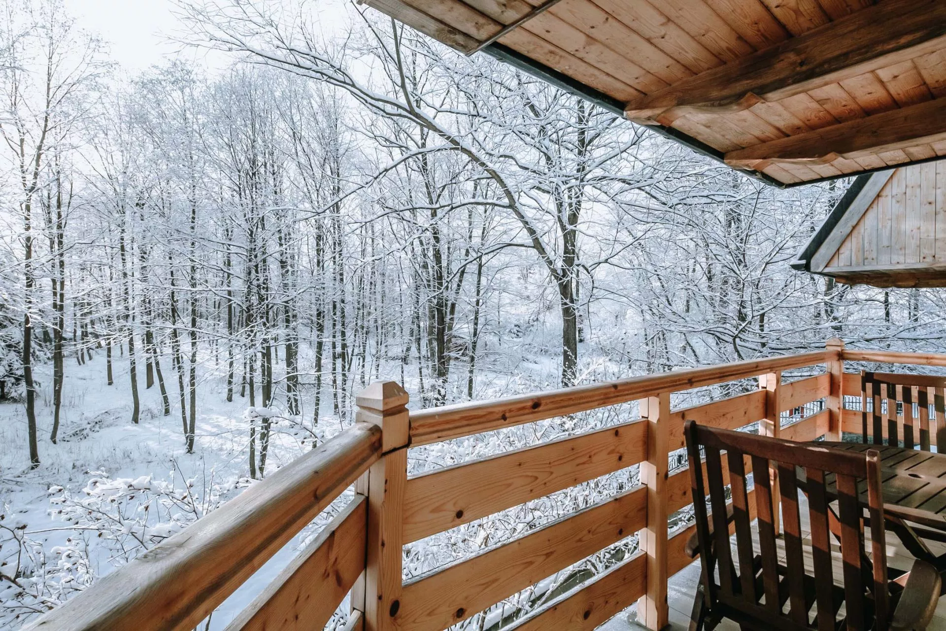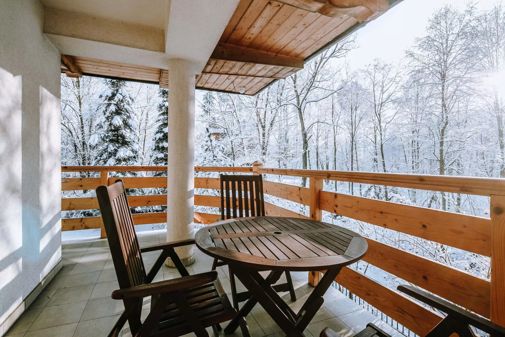 Salon z wyjściem na duży taras z meblami ogrodowymi, z którego rozpościera się widok na Tatry i las Doliny Cichej Wody z potokiem górskim przepływającym w pobliżu. Z tarasu widać także piękny i stylowy budynek Muzeum Stylu Zakopiańskiego.