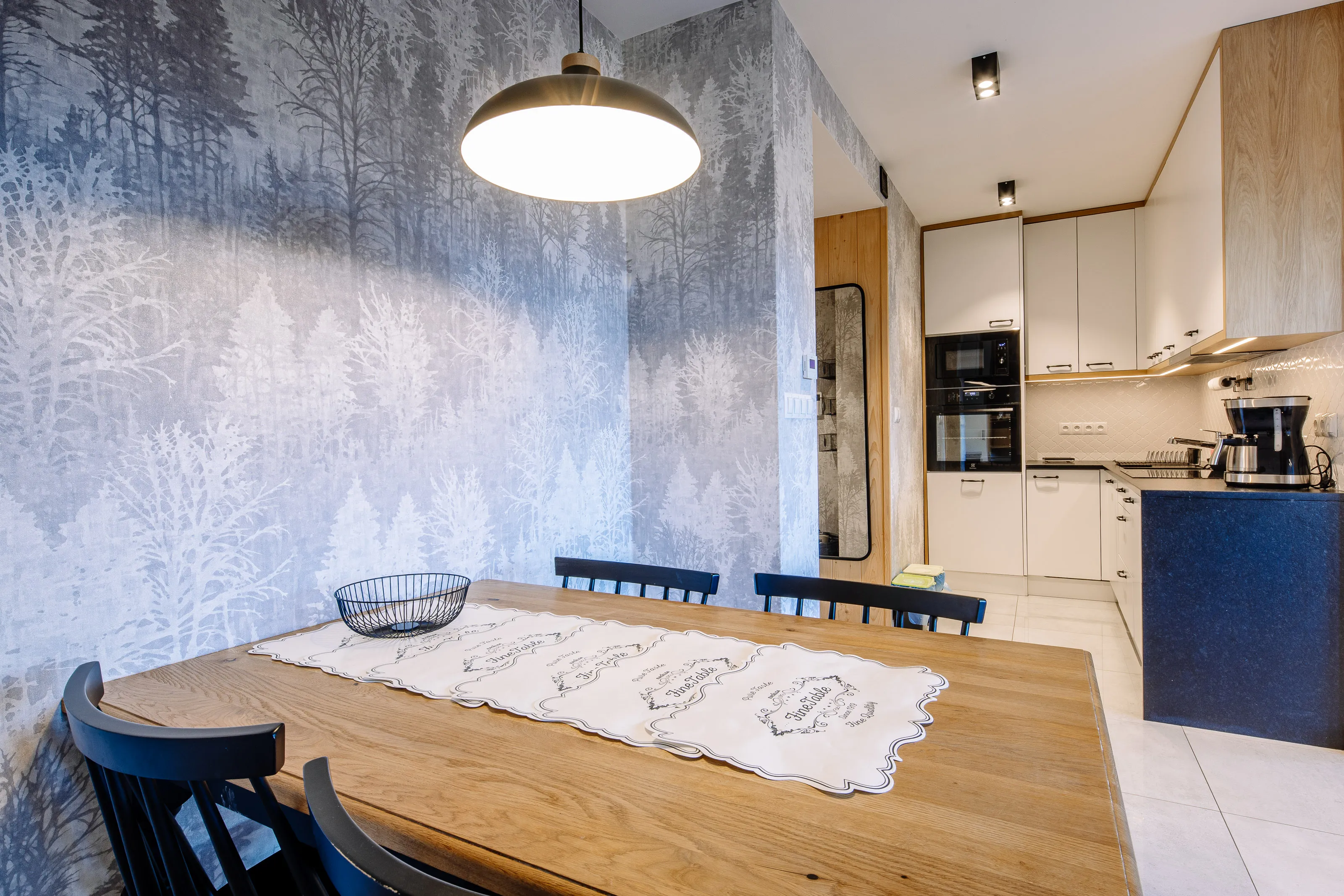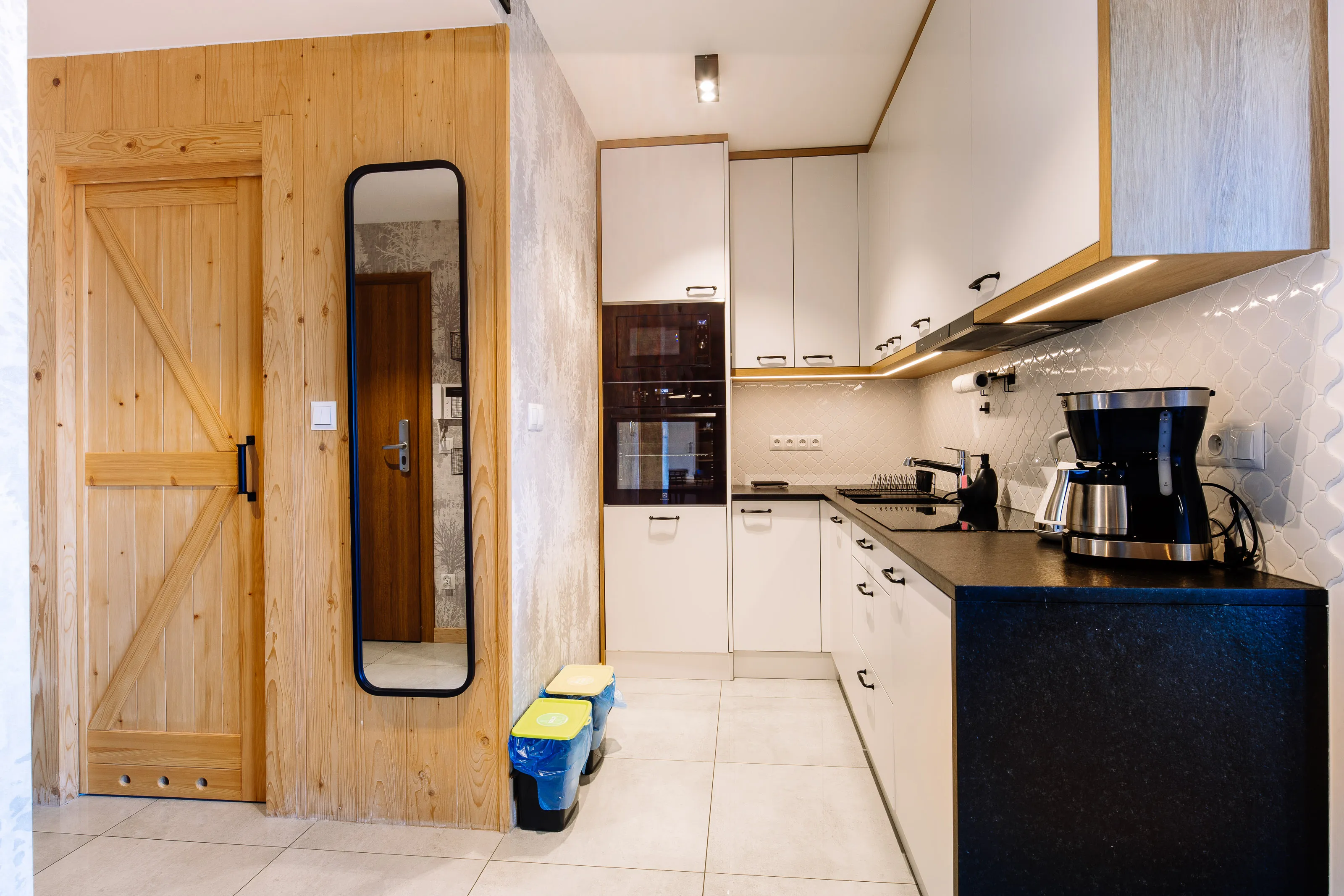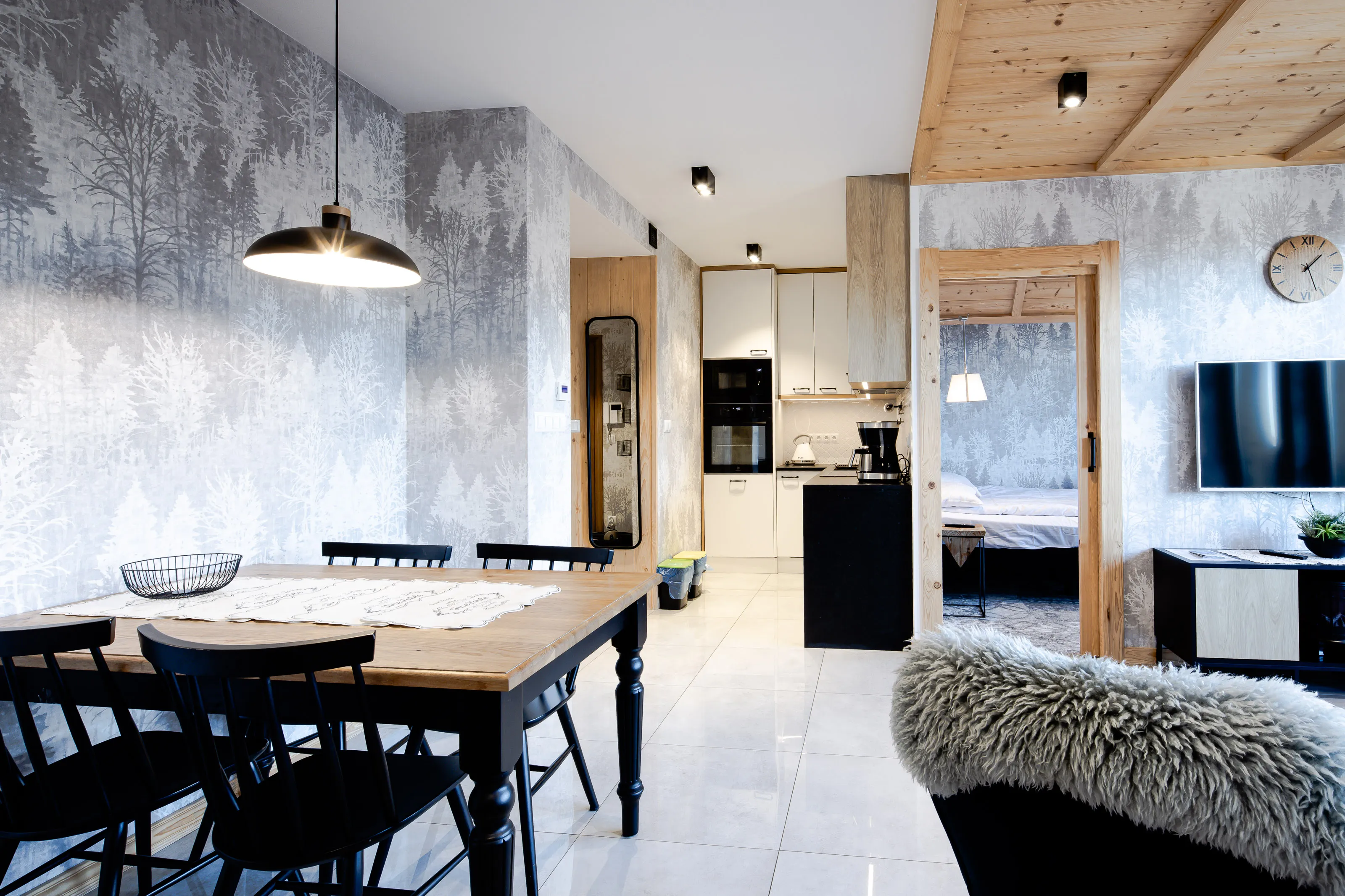 Aneks kuchenny: lodówka podblatowa, płyta indukcyjna czteropalnikowa, zmywarka, mikrofalówka, piekarnik, czajnik elektryczny, dzbanek filtrujący, zlew, zastawa szklana, kieliszki, garnki, patelnia, sztućce, akcesoria do gotowania