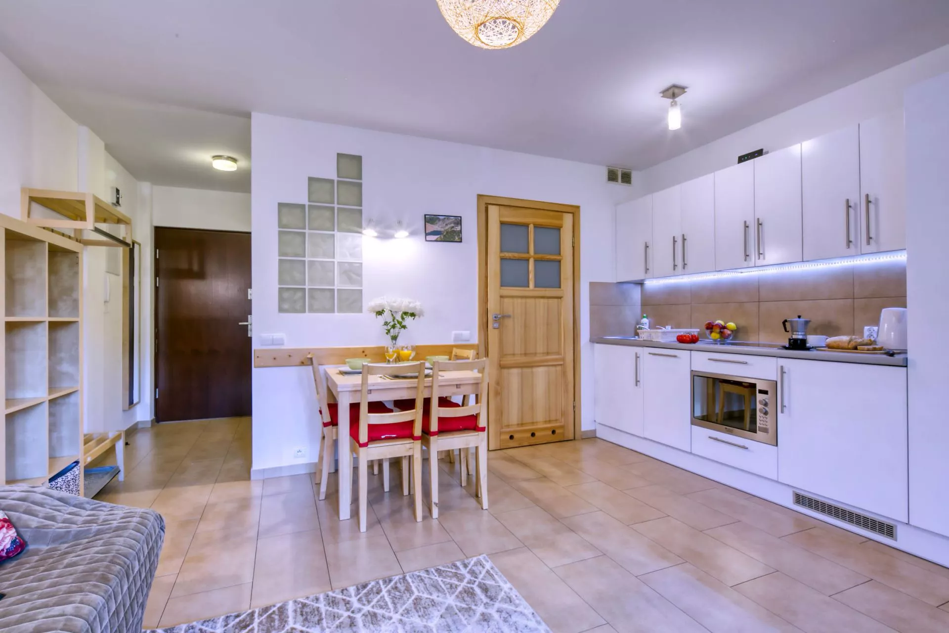 Aneks kuchenny: lodówka, zmywarka, płyta ceramiczna, kuchenka mikrofalowa, toster, naczynia, sztućce, garnki, zlew, kieliszki do wina i szampana