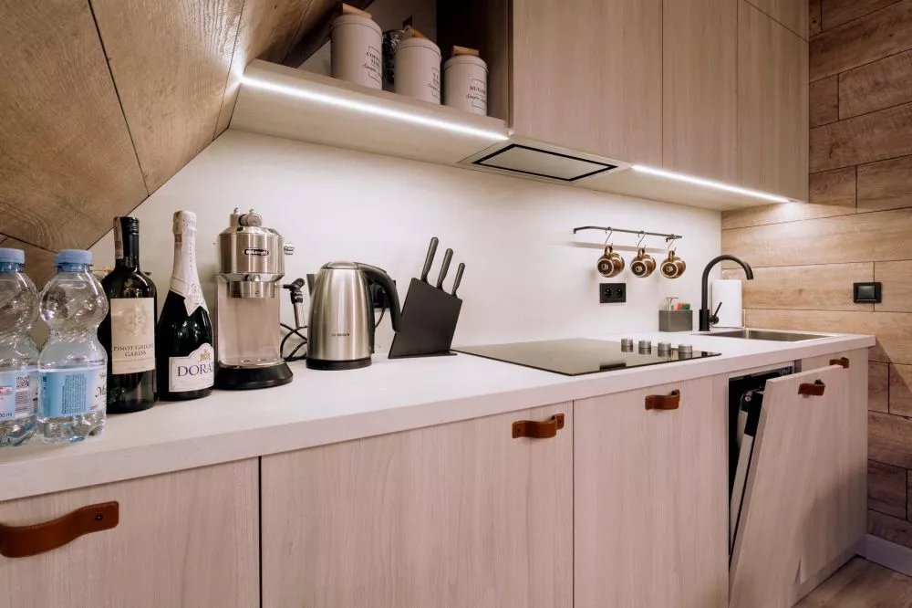 Aneks kuchenny: lodówka, 4 palnikowa płyta ceramiczna, czajnik elektryczny, ekspres ciśnieniowy do kawy, okap, zlew, komplet naczyń, sztućców, garnków, zastawa szklana, kieliszki do wina i szampana, stół kuchenny, 4 krzesła.