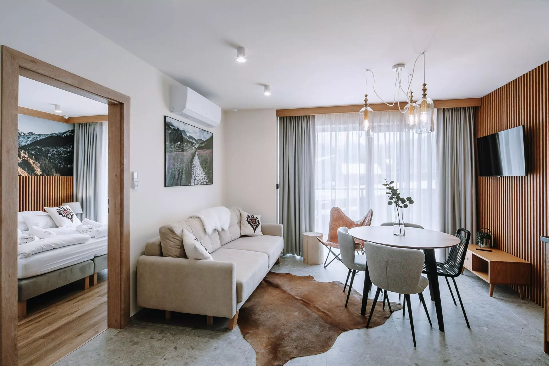 Salon: 2 osobowa rozkłada sofa, fotel, stolik kawowy, okrągły stół, 4 krzesła, TV'45, szafka rtv, wyjście na balkon z pięknym widokiem na panoramę Tatr, klimatyzacja.