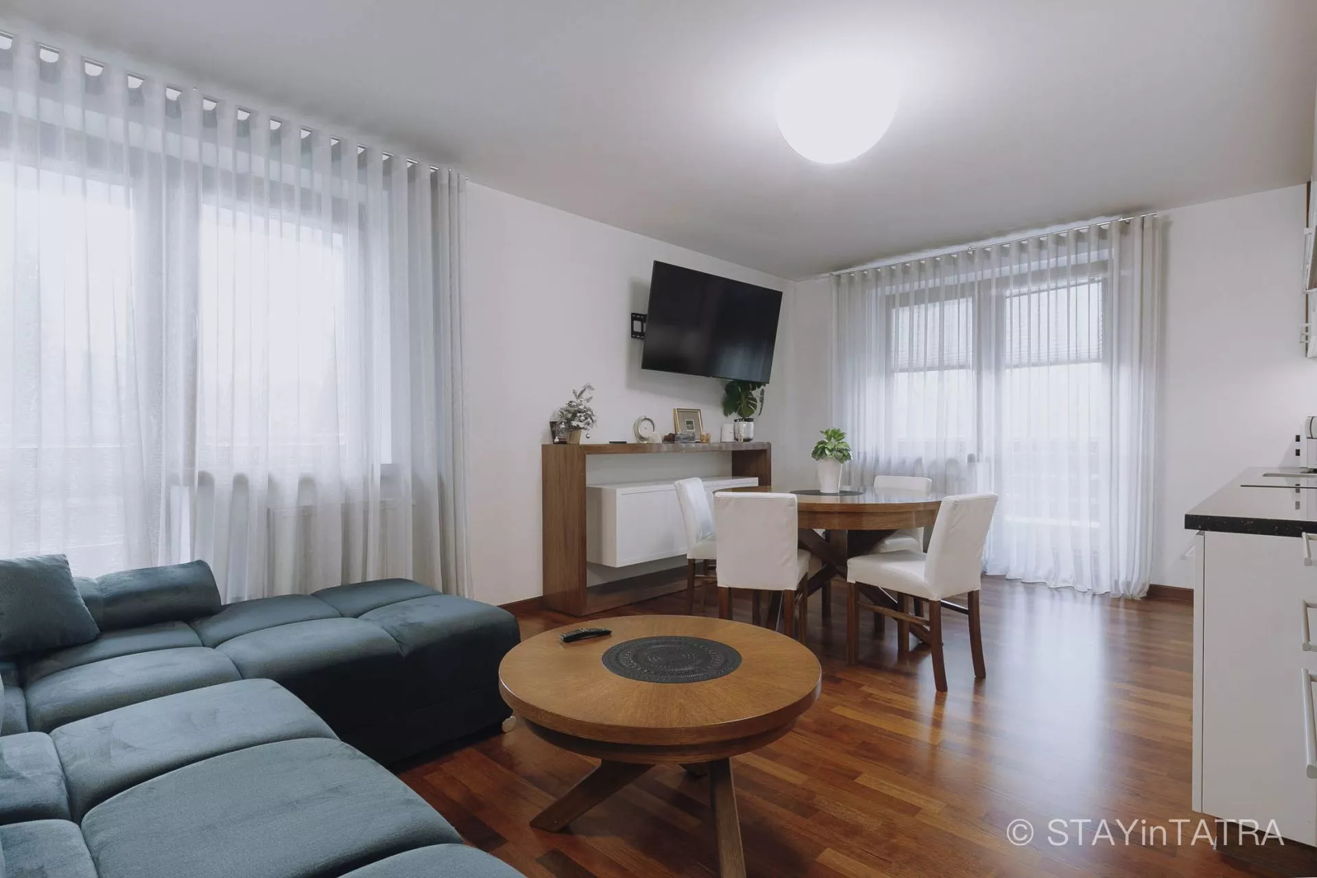 Salon: rozkładany 2-osobowy narożnik, stolik kawowy, duży okrągły stół jadalniany, 4 krzesła, TV 50’, wyjście na balkon