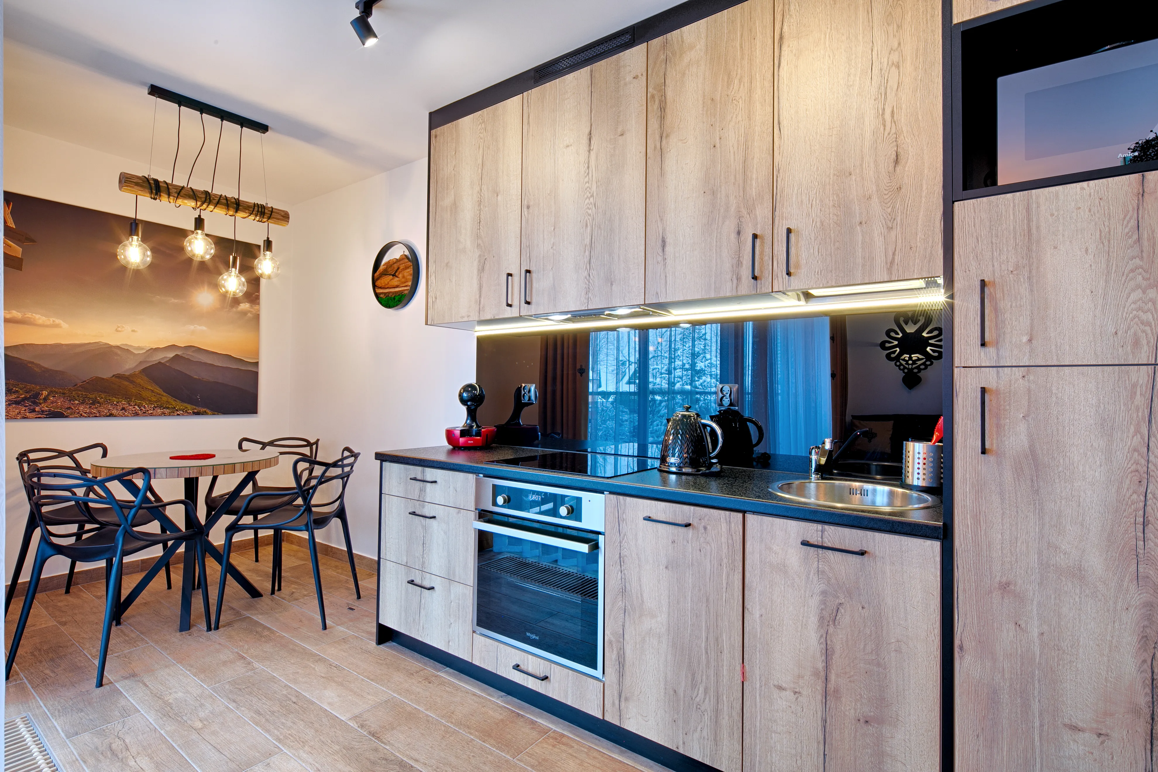 Aneks kuchenny: stół okrągły z 4 krzesłami, piekarnik, czajnik elektryczny, ekspres do kawy Nescafe Dolce Gusto, czteropalnikowa płyta indykcyjna, duża lodówka, jednokomorowy zlew, zmywarka, toster, mikrofalówka, zastawa szklana, kieliszki, garnki, patelnia, sztućce, akcesoria do gotowania
