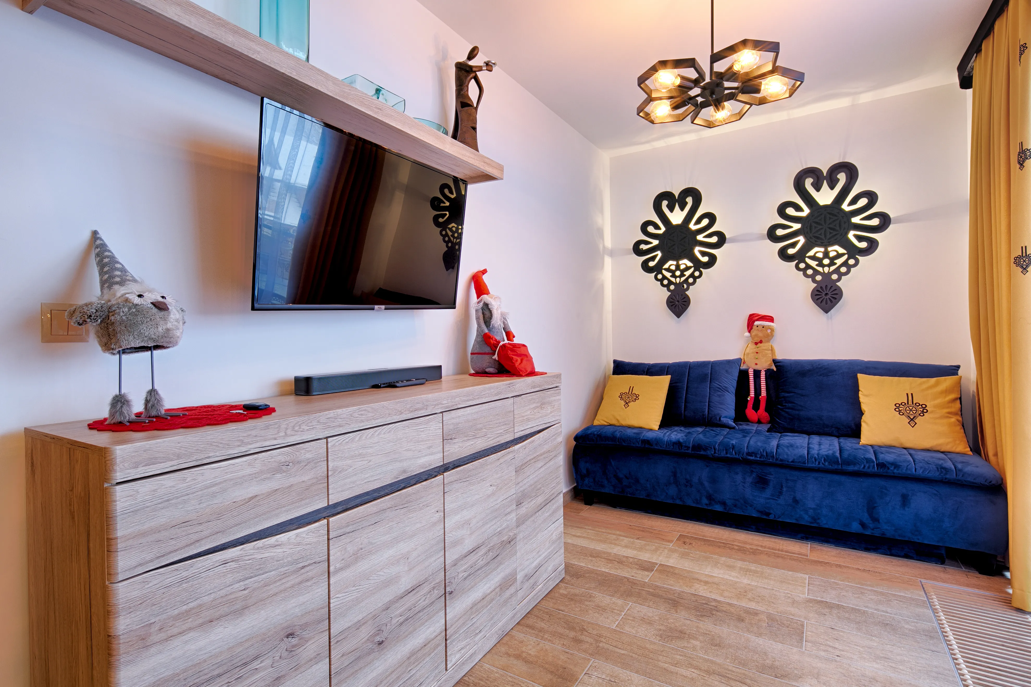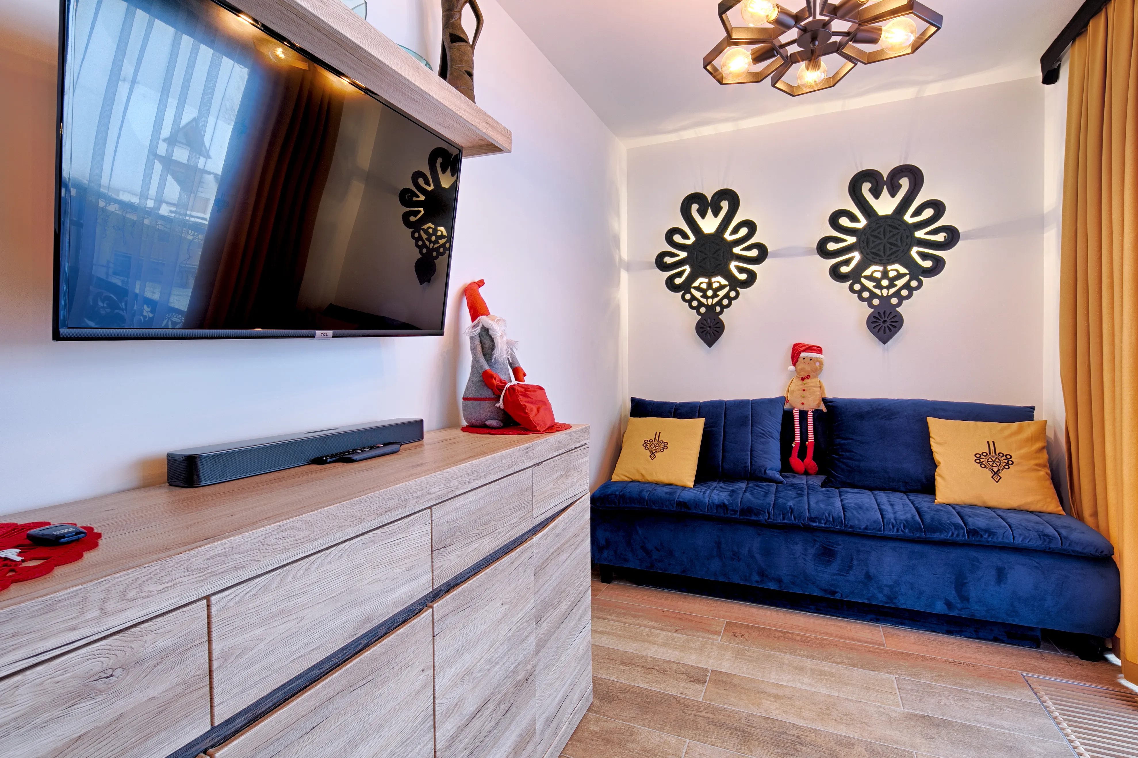 Salon: rozkładana sofa dwuosobowa, duża komoda, telewizor TCL, soundbar JBL gry, puzzle dla dzieci, przeszklona ściana, wyjście na balkon