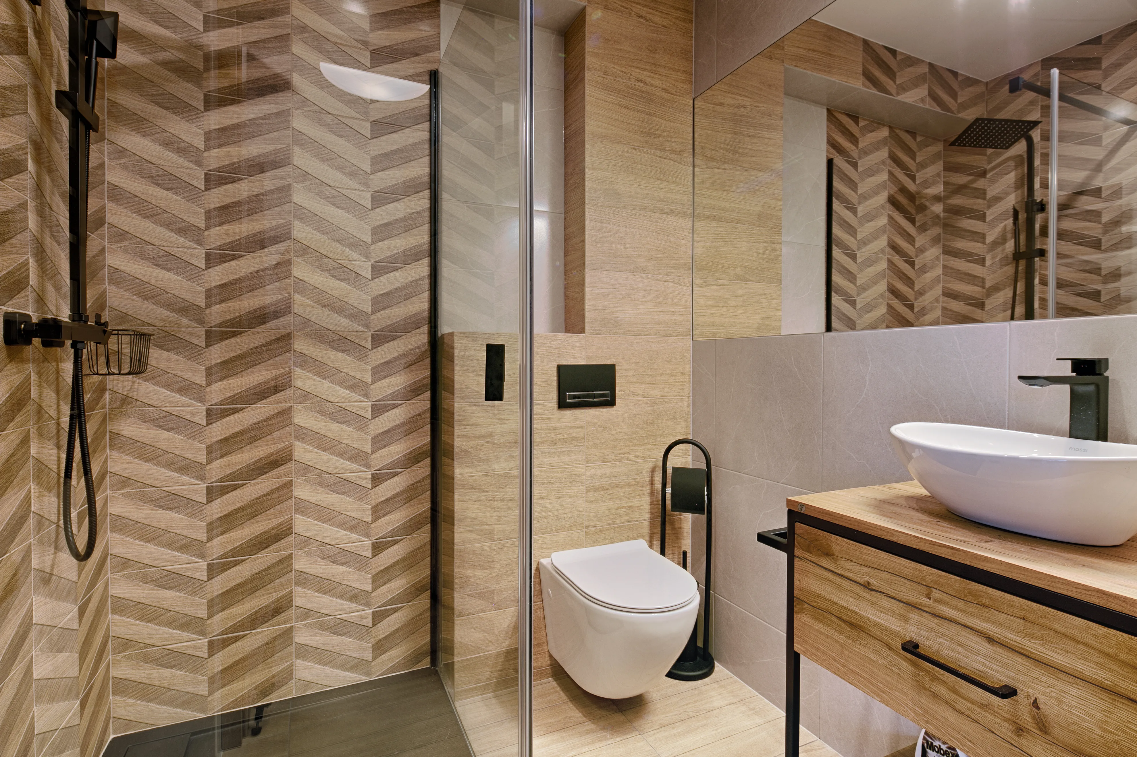 Łazienka: kabina prysznicowa z deszczownicą, wc, umywalka z szafką, lustro