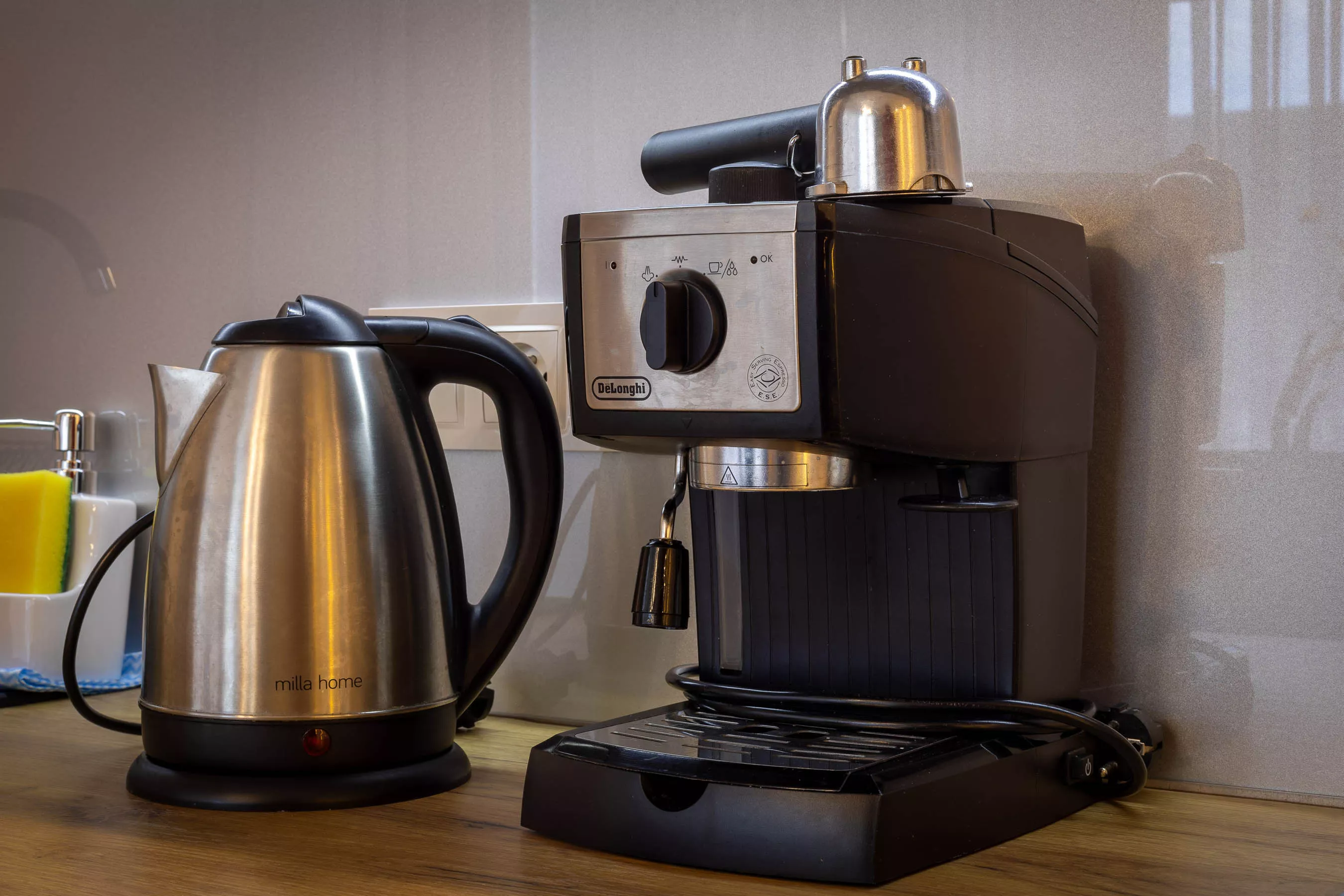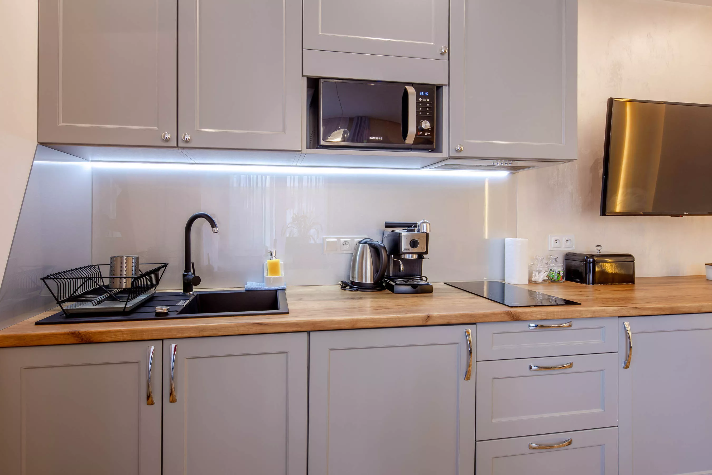 Aneks kuchenny: lodówka, 2 palnikowa płyta ceramiczna, czajnik elektryczny, ekspres do kawy, zmywarka, toster, kuchenka mikrofalowa, naczynia, sztućce, garnki, zastawa szklana
