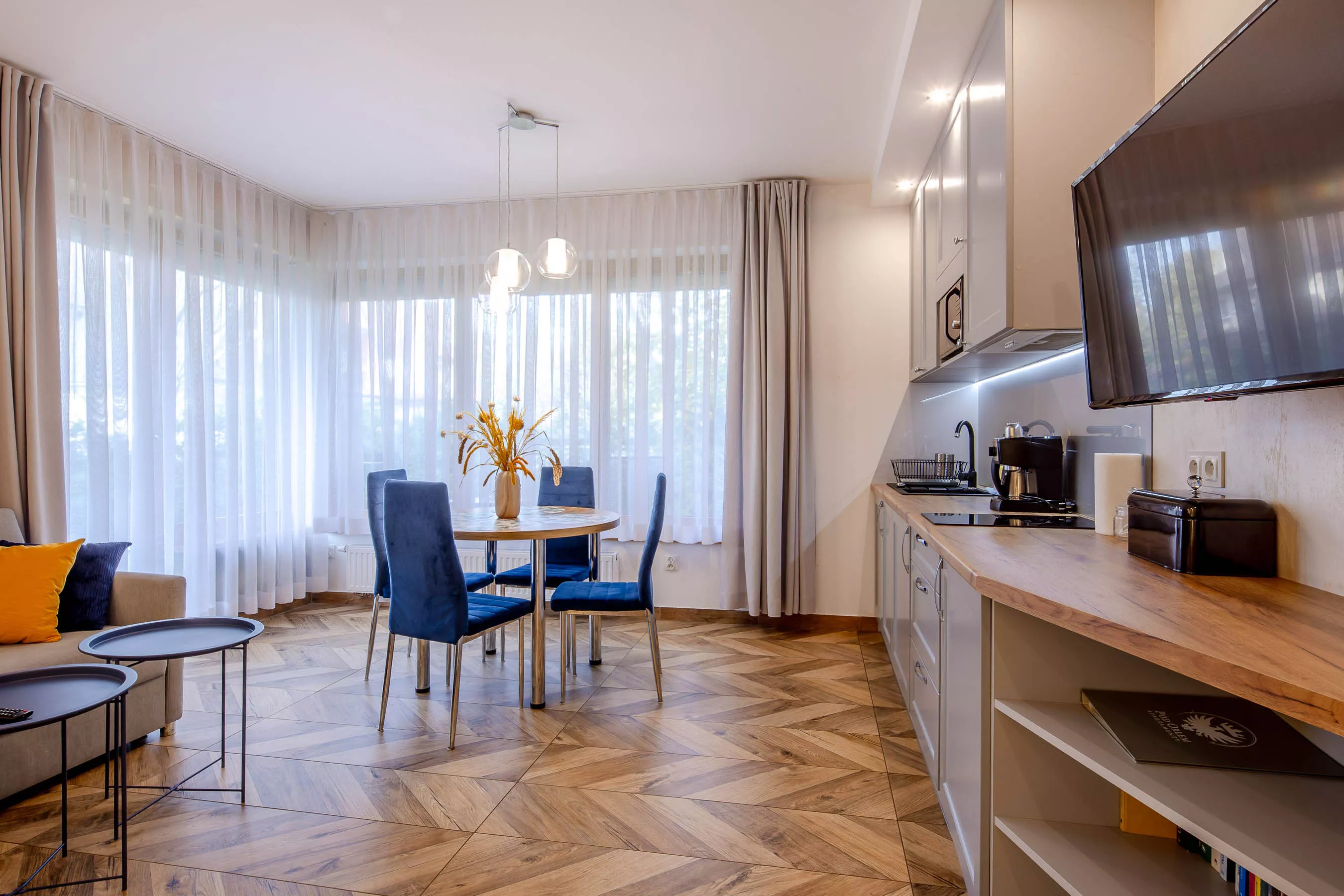 Apartament znajduje się na parterze budynku i posiada swój własny taras z meblami wypoczynkowymi. Do apartamentu przynależy dedykowane miejsce parkingowe w hali garażowej pod budynkiem apartamentowca.