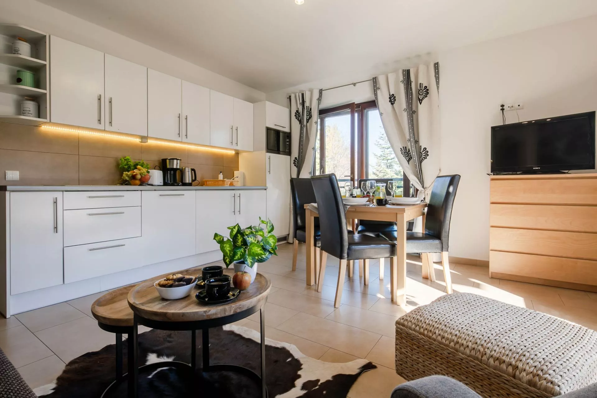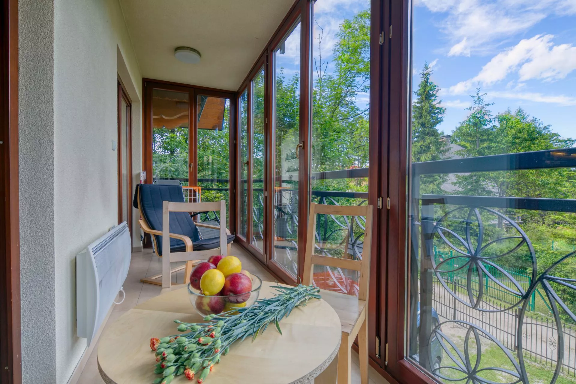 Apartament dla 6 osób, z dwiema osobnymi sypialniami, salonem, aneksem kuchennym, łazienką, balkonem i ogrodem zimowym. Ścisłe centrum, 5 minut od Krupówek. Apartament znajduje się na 1 piętrze stylowego budynku apartamentowca. Dla gości apartamentu zarezerwowane jest 1 miejsce parkingowe w garażu podziemnym. Brama wjazdowa do garażu podziemnego ma wysokość 2 m i szerokość 3 m. Teren wokół apartamentowca jest ogrodzony, a okolica bardzo bezpieczna i cicha. Budynek zlokalizowany jest praktycznie w samym centrum Zakopanego. Od Krupówek dzieli go 5 minutowy spacer. W odległości 300m znajduje się wejście do Doliny Białego - miejsca z którego rozpoczyna się szereg szlaków tatrzańskich. Odległości do innych popularnych miejsc turystycznych: Park Miejski - 500m, Skocznia narciarska i trasy biegowe - 1500m, kino Sokół - 700m, basen, SPA, siłownia - 250m, sklep spożywczy - 100m, Restauracje i Karczmy Regionalne - 200m.