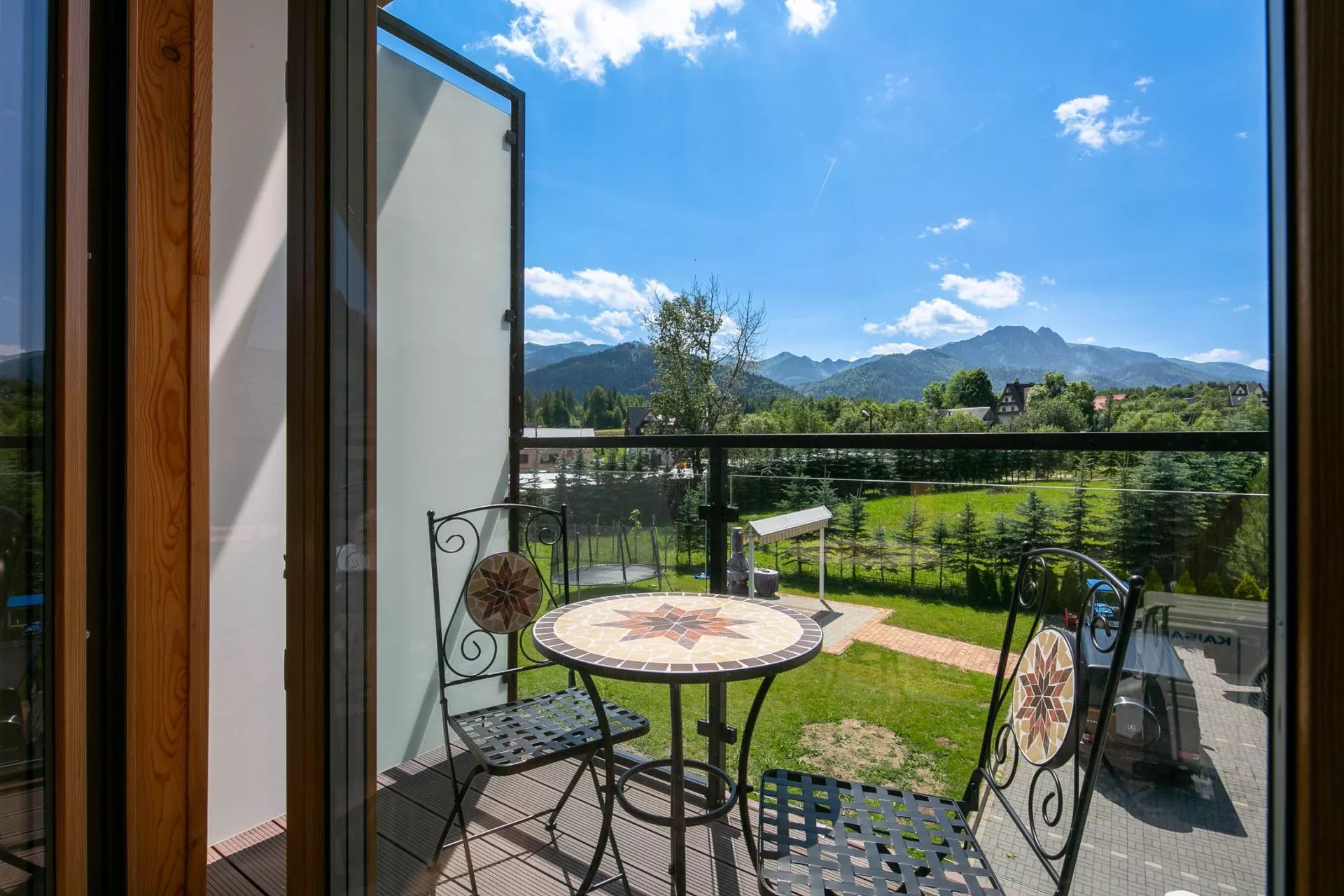 Salon - 1 osobowa nierozkładana sofa, TV'40, stolik kawowy, wyjście na balkon (widok na panoramę Tatr, stolik i 2 krzesła), klimatyzacja