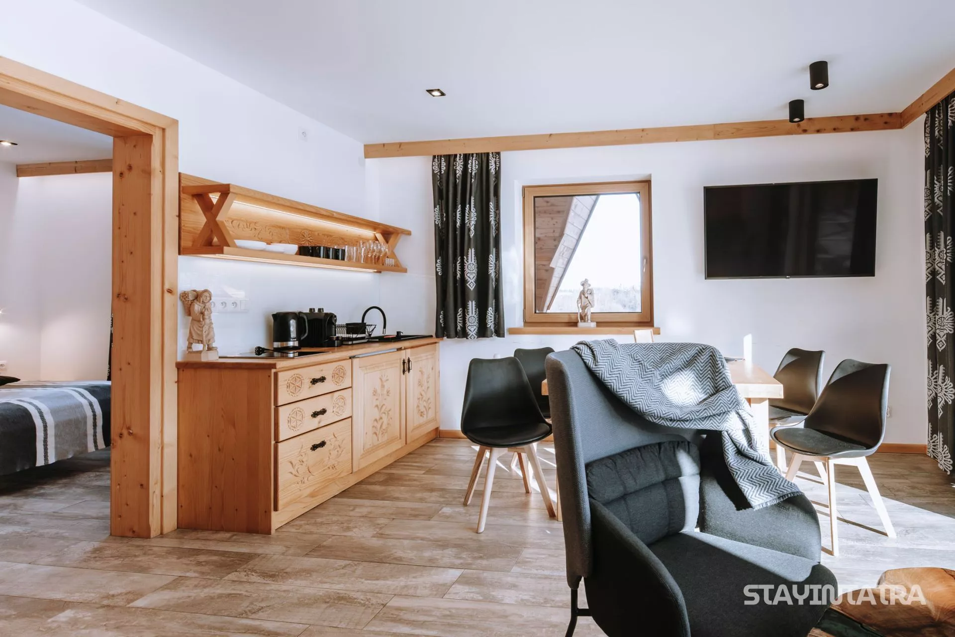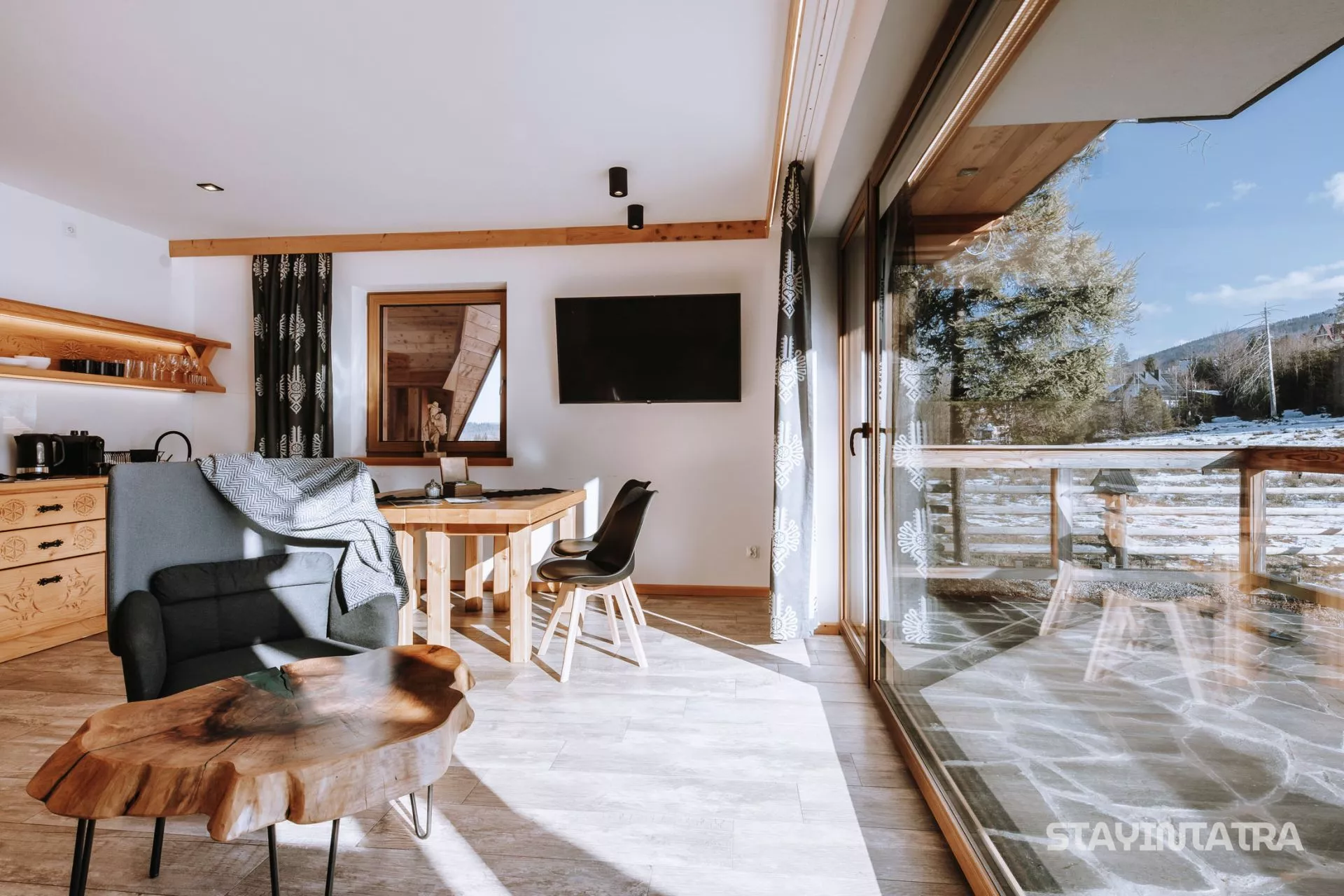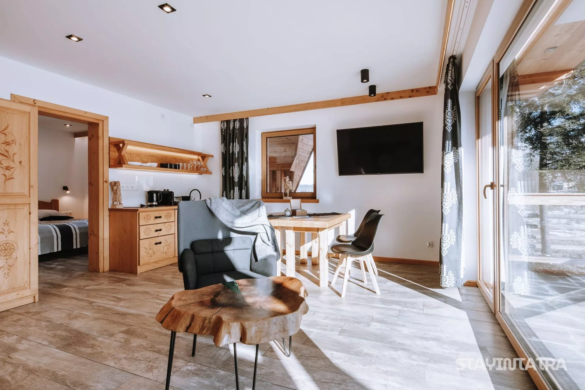 Struktura apartamentu: przedpokój, salon z aneksem kuchennym, osobna sypialnia (łóżko małżeńskie), łazienka, duży taras z pięknym widokiem na góry / Apartament zlokalizowany na parterze.