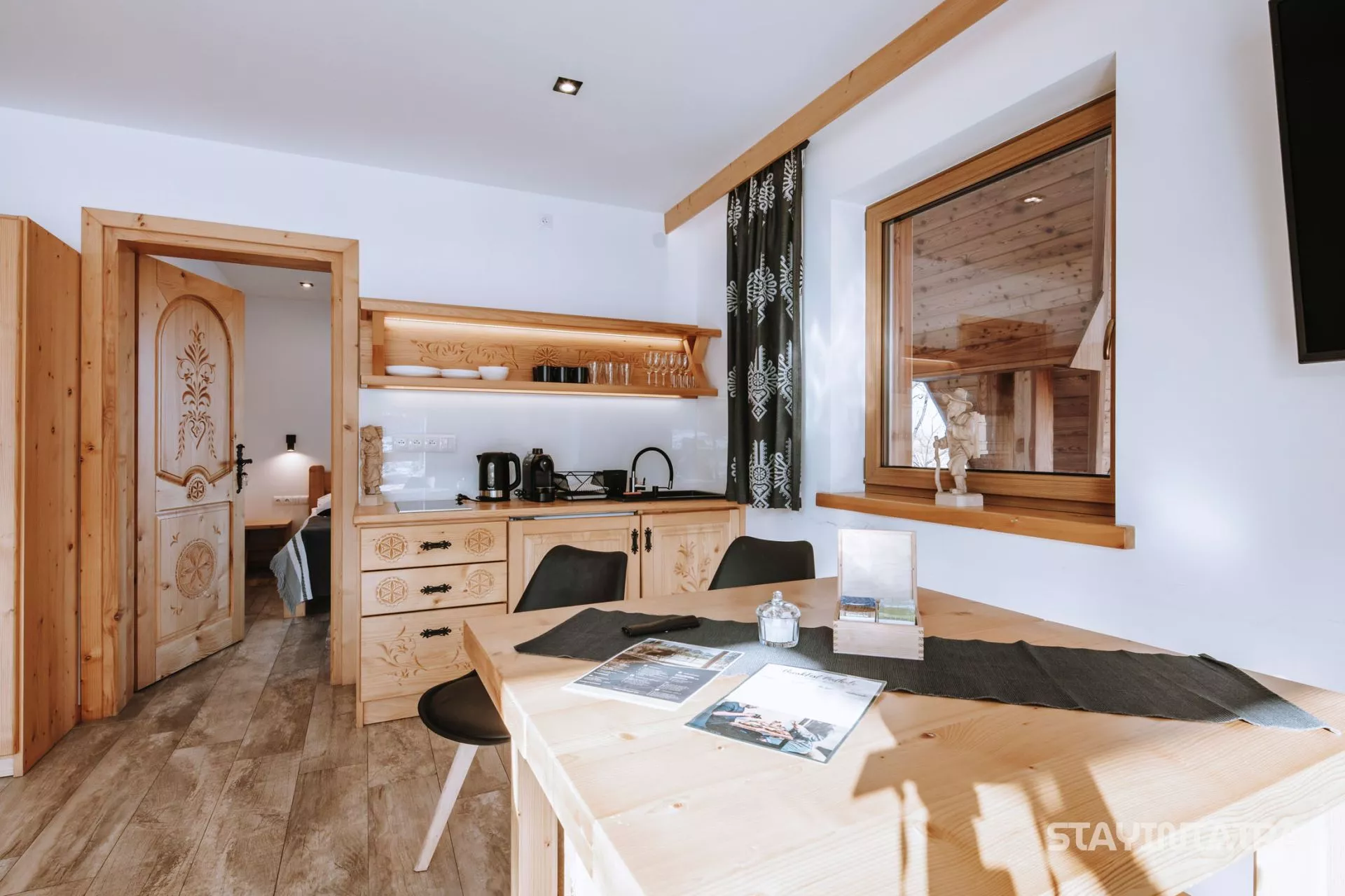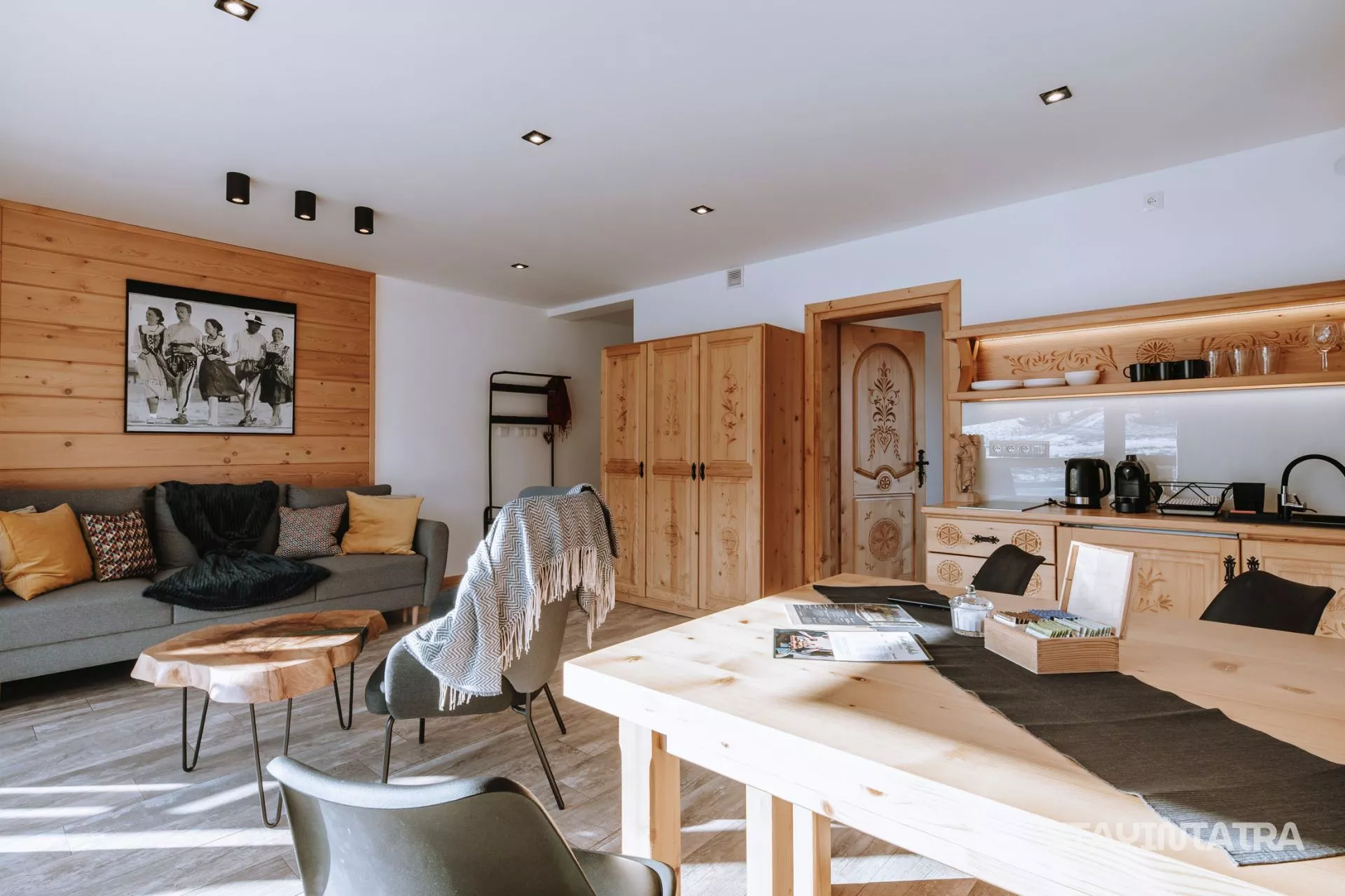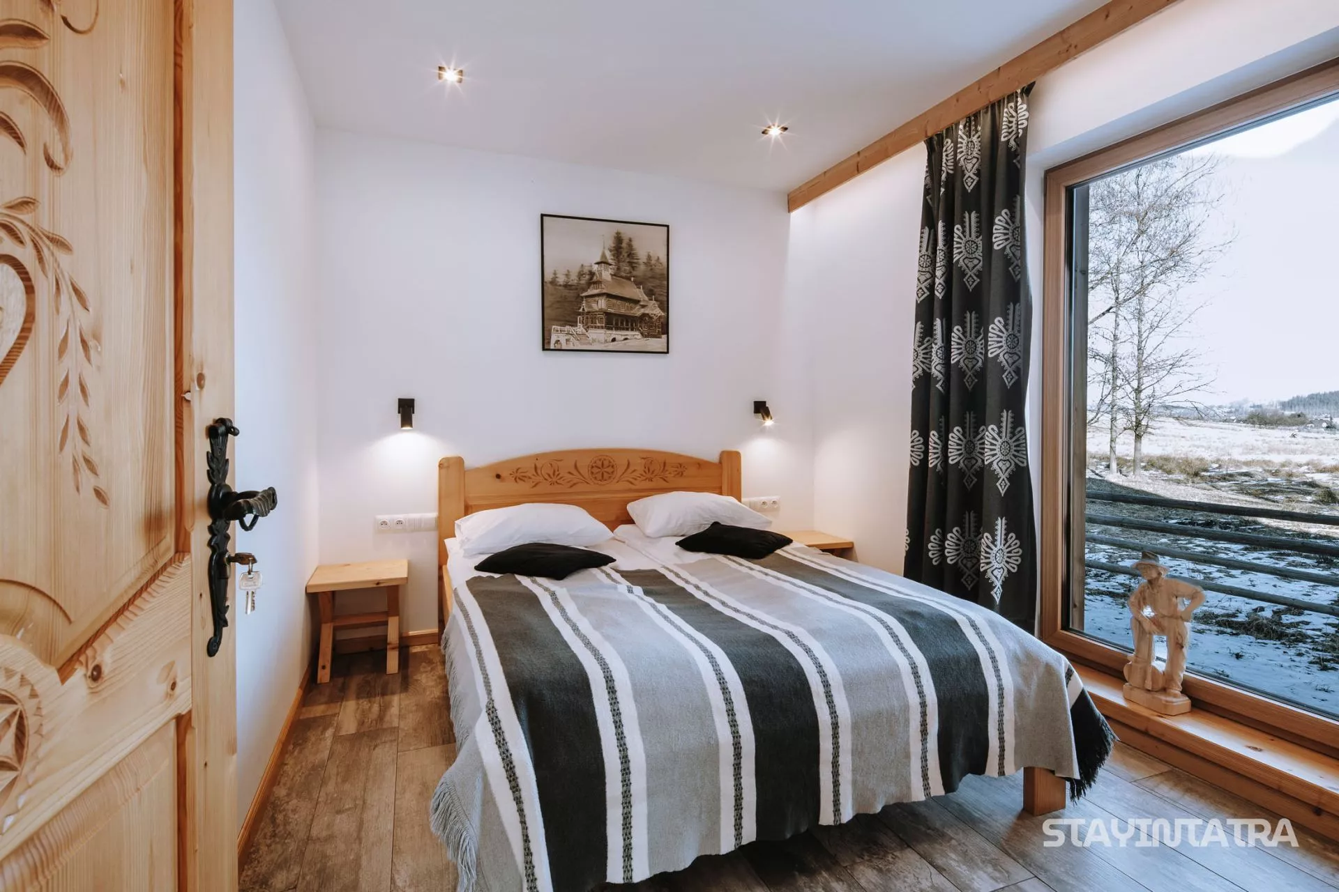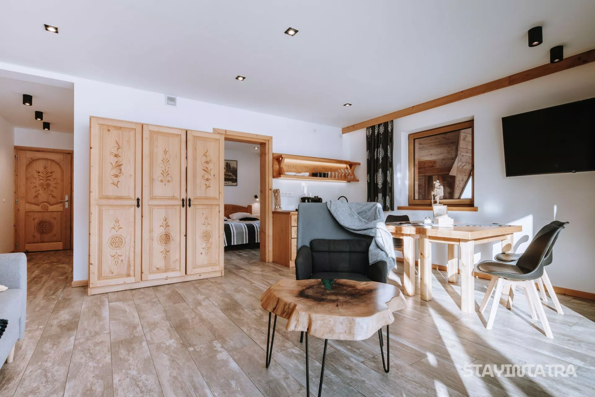 Struktura apartamentu: przedpokój, salon z aneksem kuchennym, osobna sypialnia (łóżko małżeńskie), łazienka, duży taras z pięknym widokiem na góry / Apartament zlokalizowany na parterze.