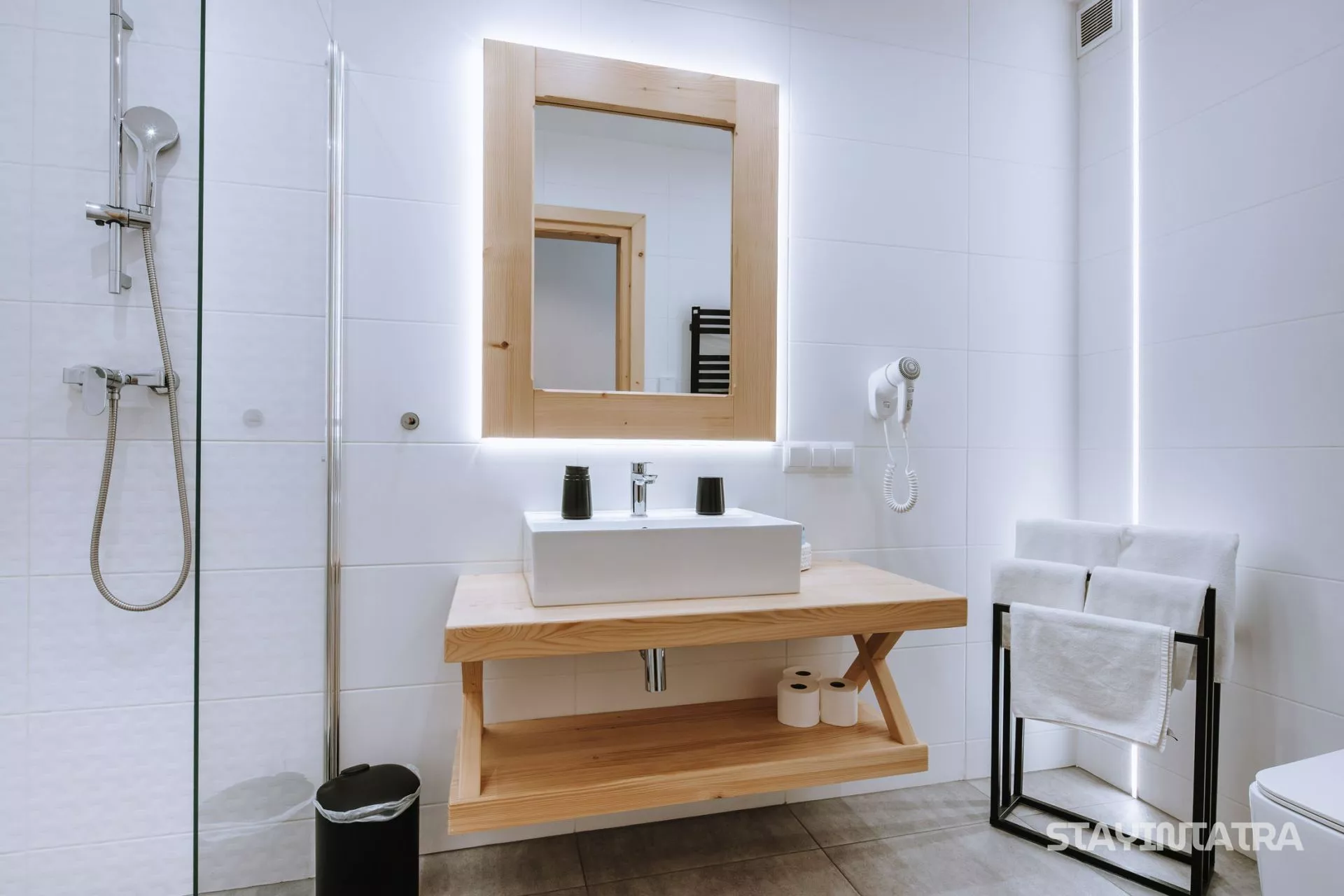 Łazienka: prysznic, toaleta, umywalka, grzejnik ręcznikowy, suszarka do włosów