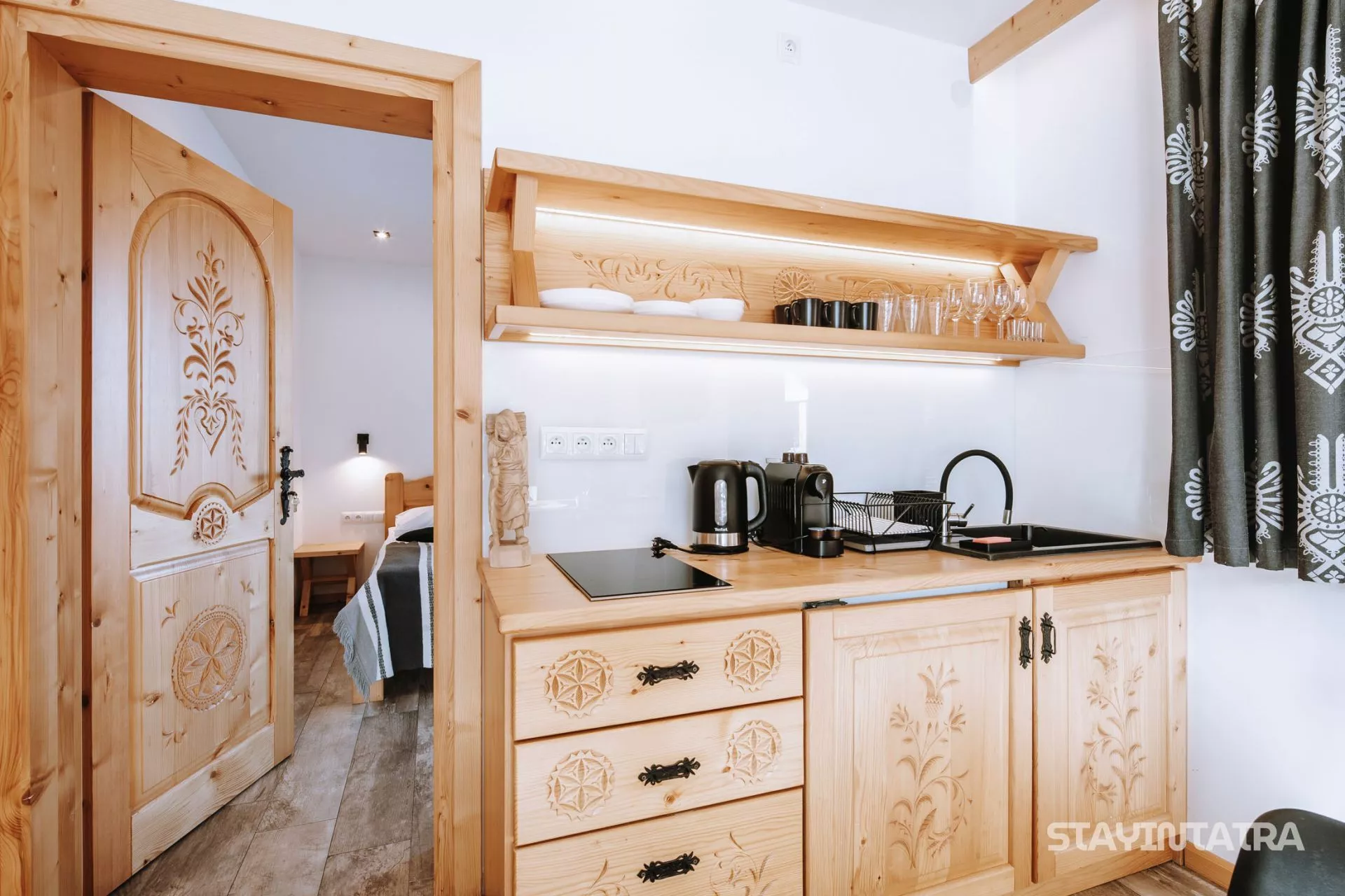 Aneks kuchenny: ekspres do kawy na kapsułki (Cafissimo), czajnik elektryczny, 2-palnikowa płyta elektryczna, lodówka, komplet naczyń, garnków i sztućców, zastawa szklana