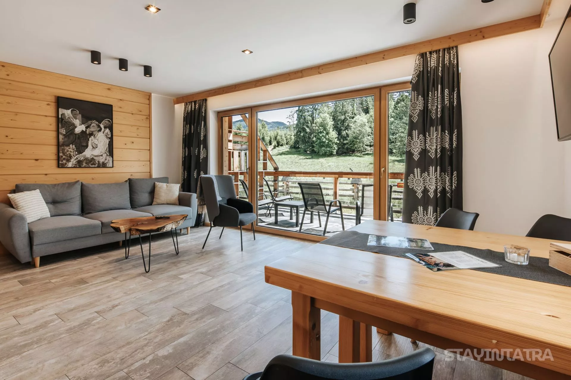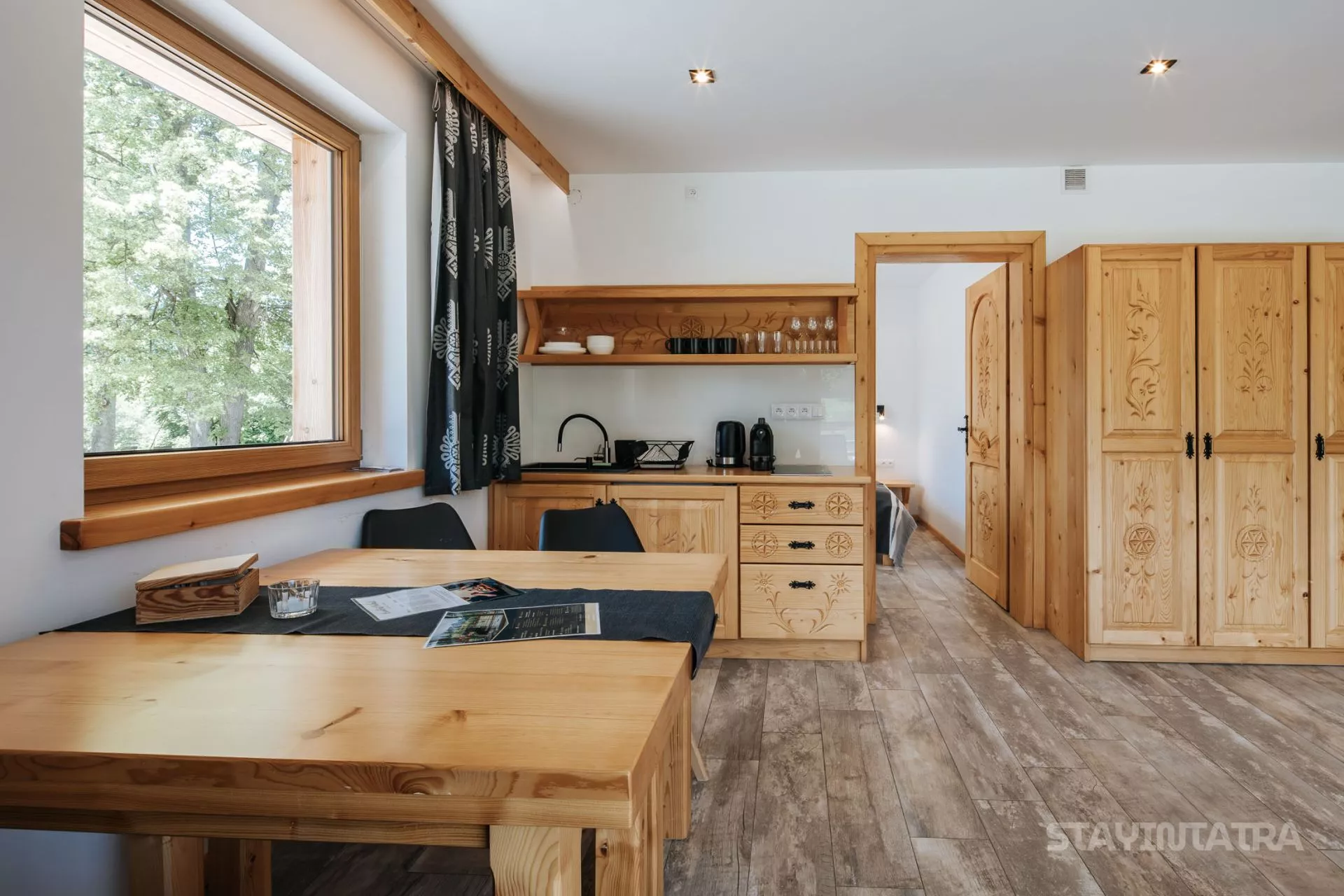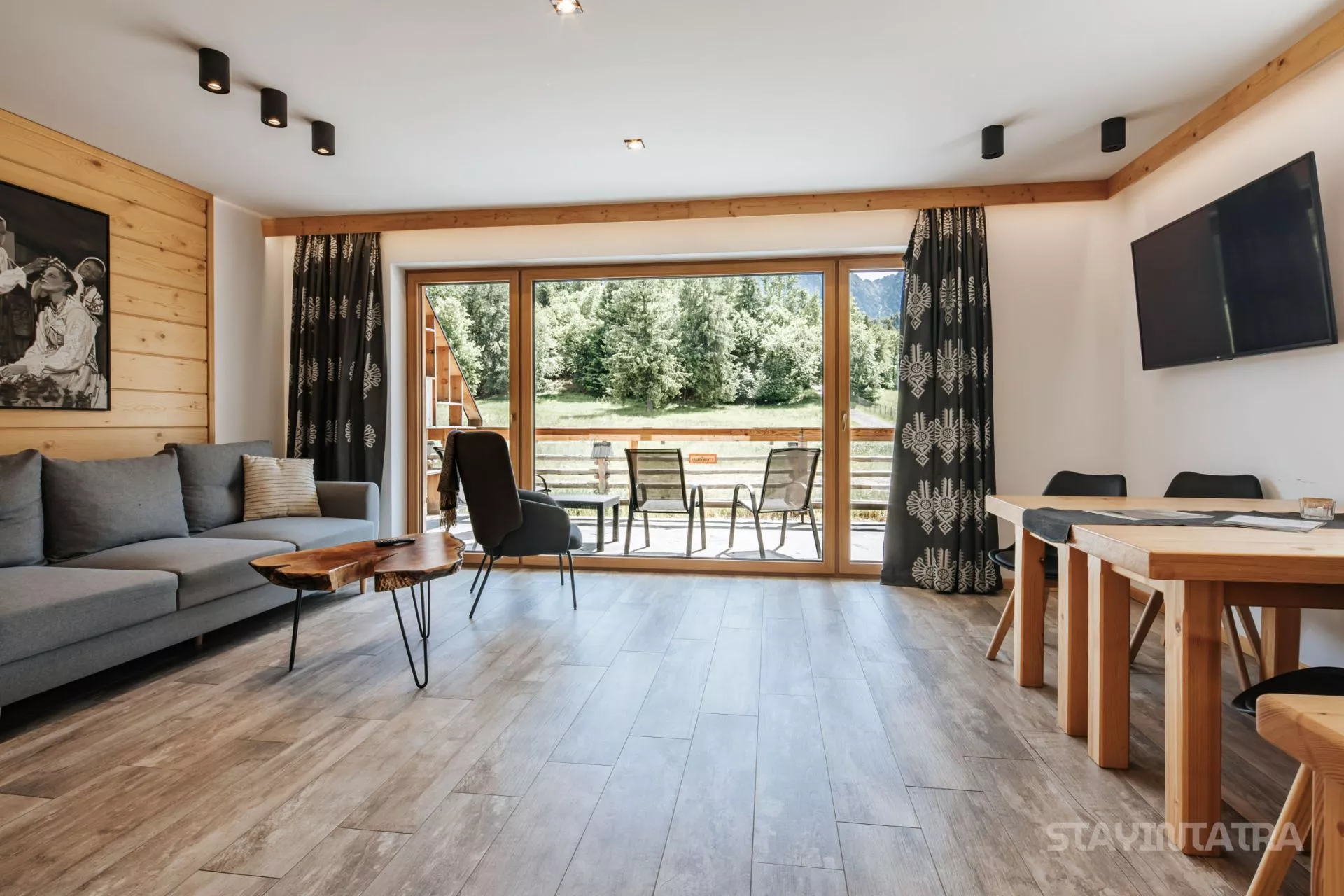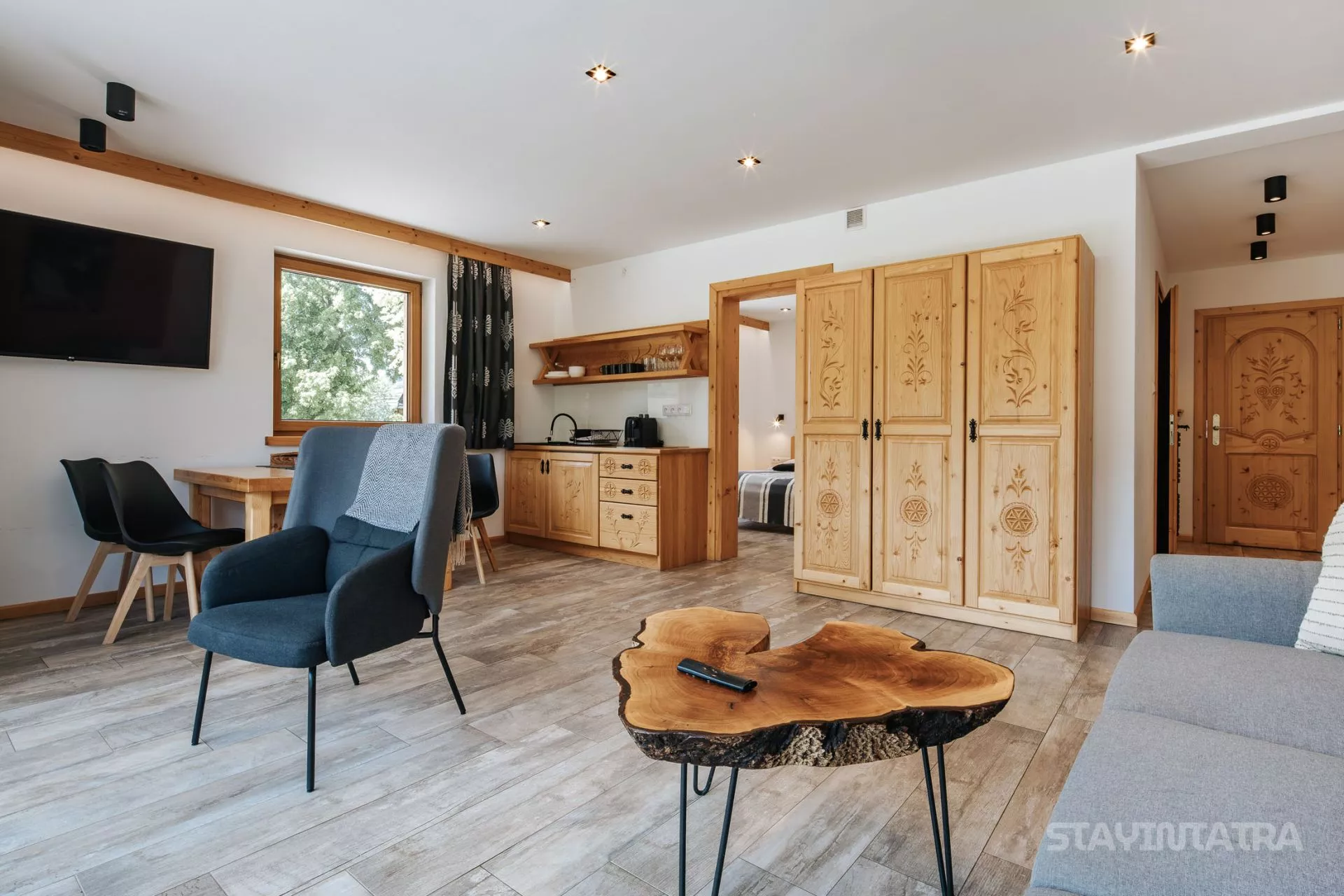 Struktura apartamentu: przedpokój, salon z aneksem kuchennym, osobna sypialnia (łóżko małżeńskie), łazienka, duży taras z pięknym widokiem na góry / Apartament zlokalizowany na parterze.