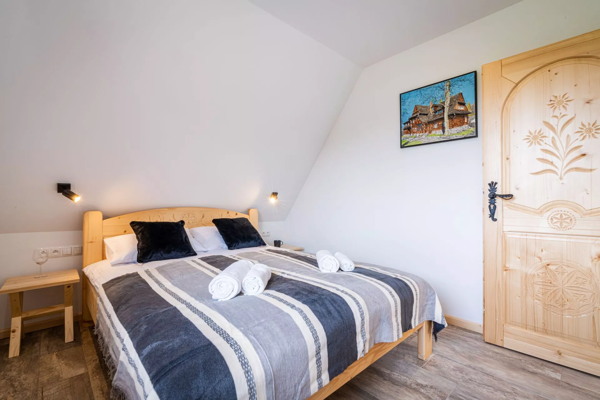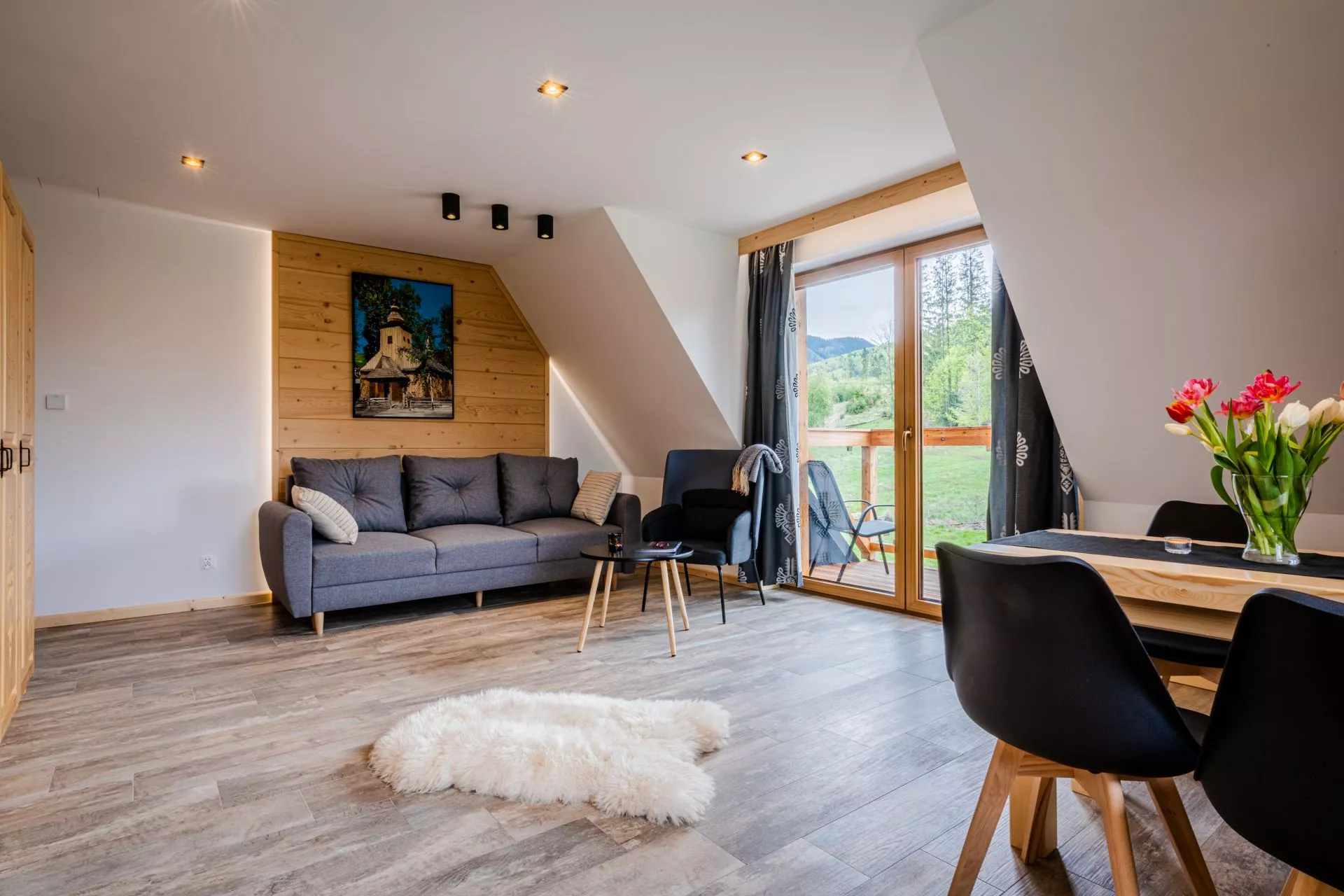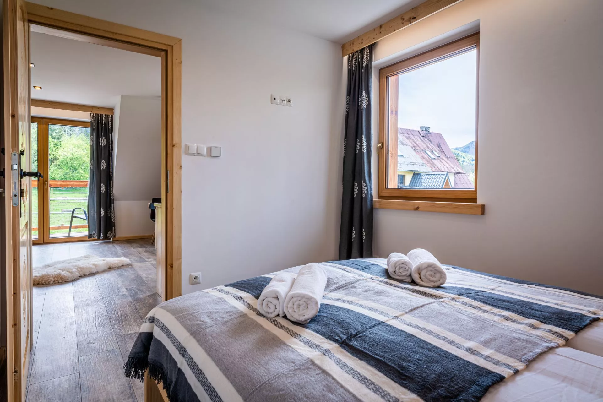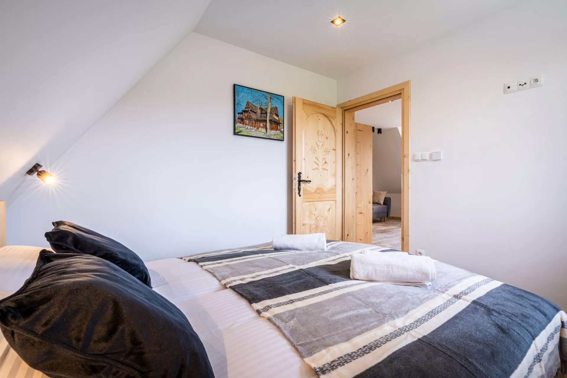 Struktura apartamentu: przedpokój, salon z aneksem kuchennym, osobna sypialnia (łóżko małżeńskie), łazienka, balkon z pięknym widokiem na góry