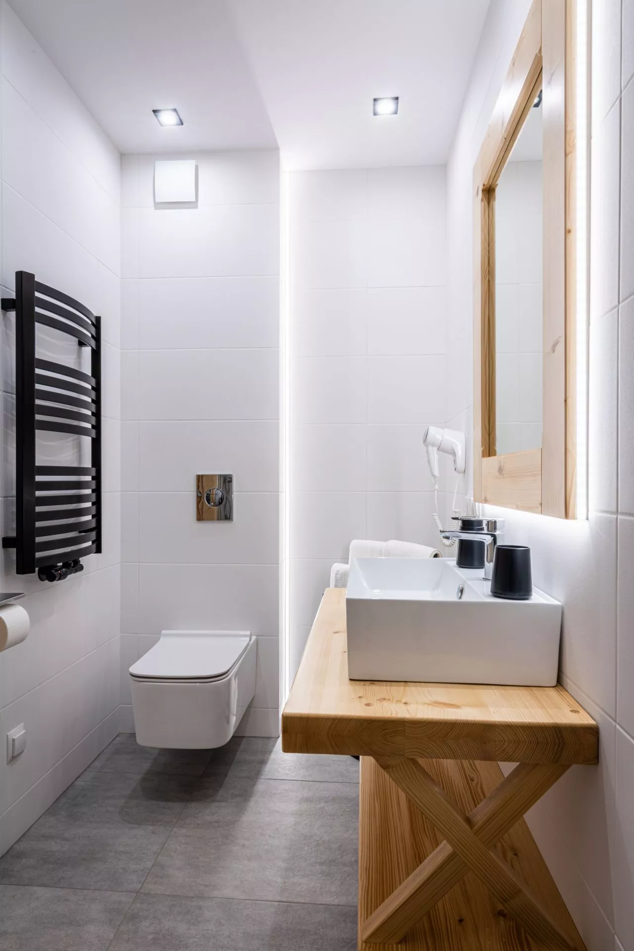 Łazienka: prysznic, toaleta, umywalka, grzejnik ręcznikowy, suszarka do włosów