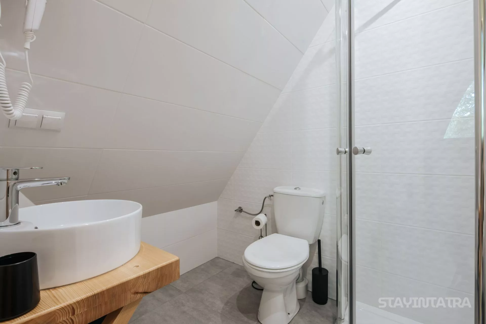 Łazienka: prysznic, toaleta, umywalka, grzejnik ręcznikowy, suszarka do włosów