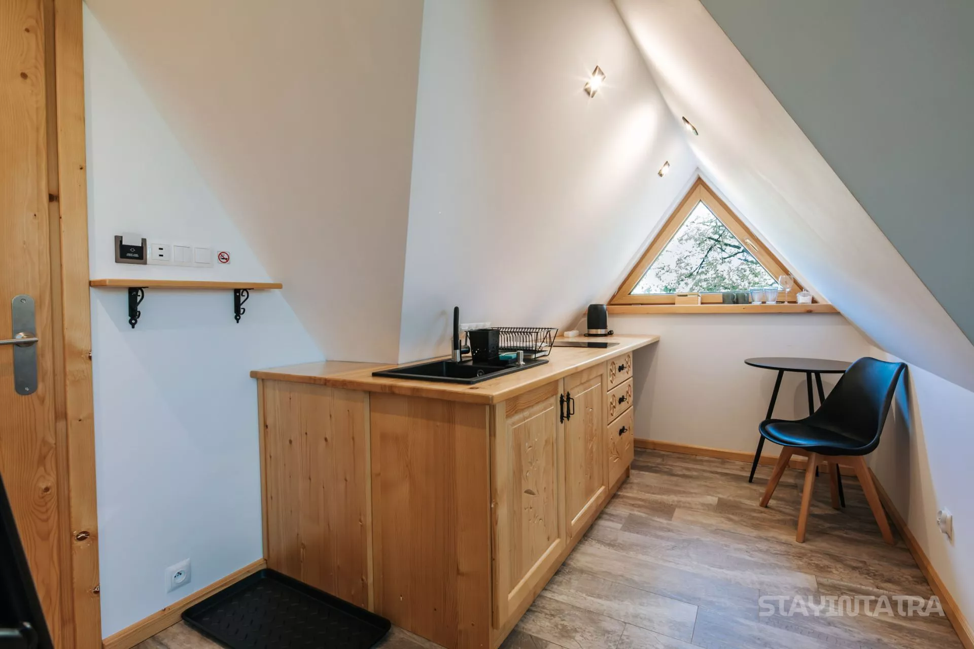 Aneks kuchenny: czajnik elektryczny, 2-palnikowa płyta elektryczna, lodówka, komplet naczyń, garnków i sztućców, zastawa szklana (aneks kuchenny pozwala na przygotowanie prostych podstawowych posiłków).