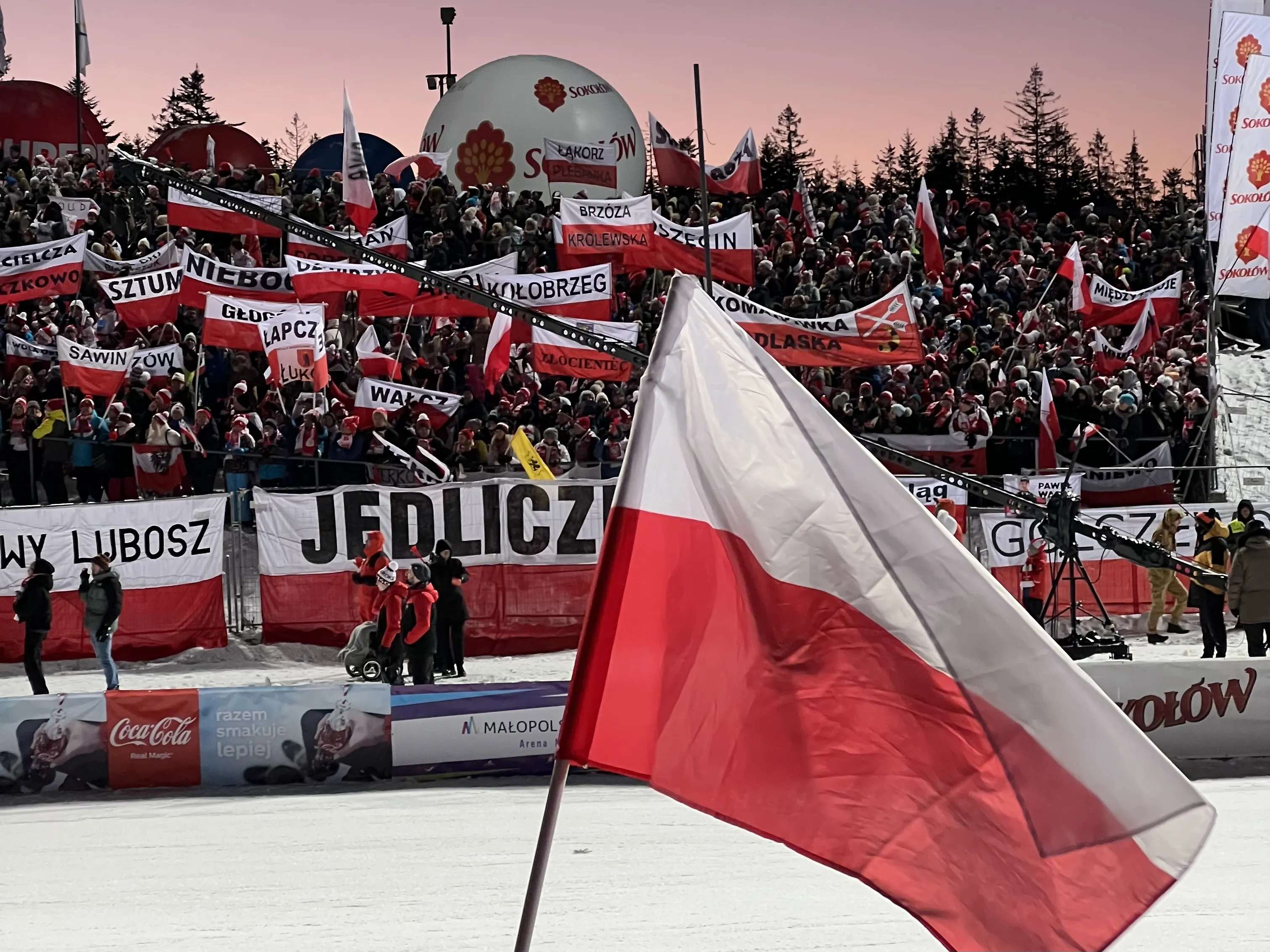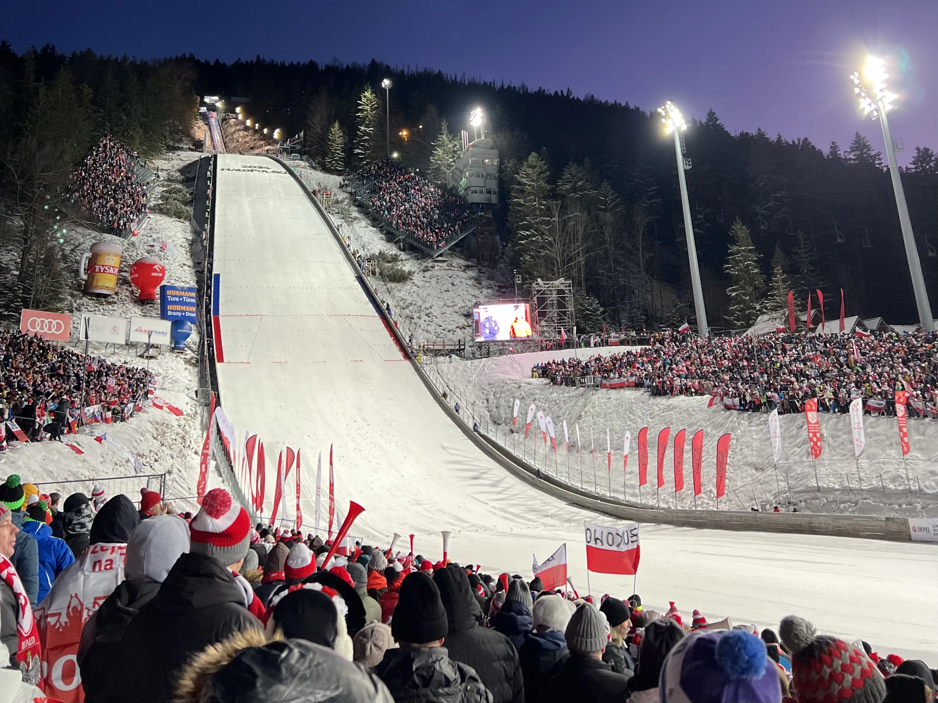 Najważniejszym elementem Twojego ekwipunku jest bilet na zawody i dowód osobisty. Pamiętaj o tym, żeby się odpowiednio ubrać. Oczywiście wszystko zależy od pogody. Zakładając, że pogoda będzie typowo #zimowa, zabierz ze sobą ciepłe ubrania i przede wszystkim ciepłe rękawiczki i buty. Mogą przydać Ci się ogrzewacze do rąk i do stóp – przetestowany patent, polecamy! Koniecznie weź ze sobą biało-czerwony akcent – szalik, trąbkę, czapkę, jeżeli takiego nie posiadasz – spokojnie, w drodze na skocznie z całą pewnością napotkasz wiele stoisk i straganów, na których będziesz mógł się zaopatrzyć w gadżety kibica. Zabierz ze sobą naładowany telefon komórkowy, aby w razie czego skontaktować się ze swoją ekipą – tak będzie Wam łatwiej odnaleźć się w tłumie. Kolejnym must have są rękawiczki – bez nich nie wychodź z domu! A! Jeszcze jedno: koniecznie zabierz ze sobą czekoladę lub coś słodkiego. Takie przysmaki na Pucharze Świata smakują jak zwycięstwo!