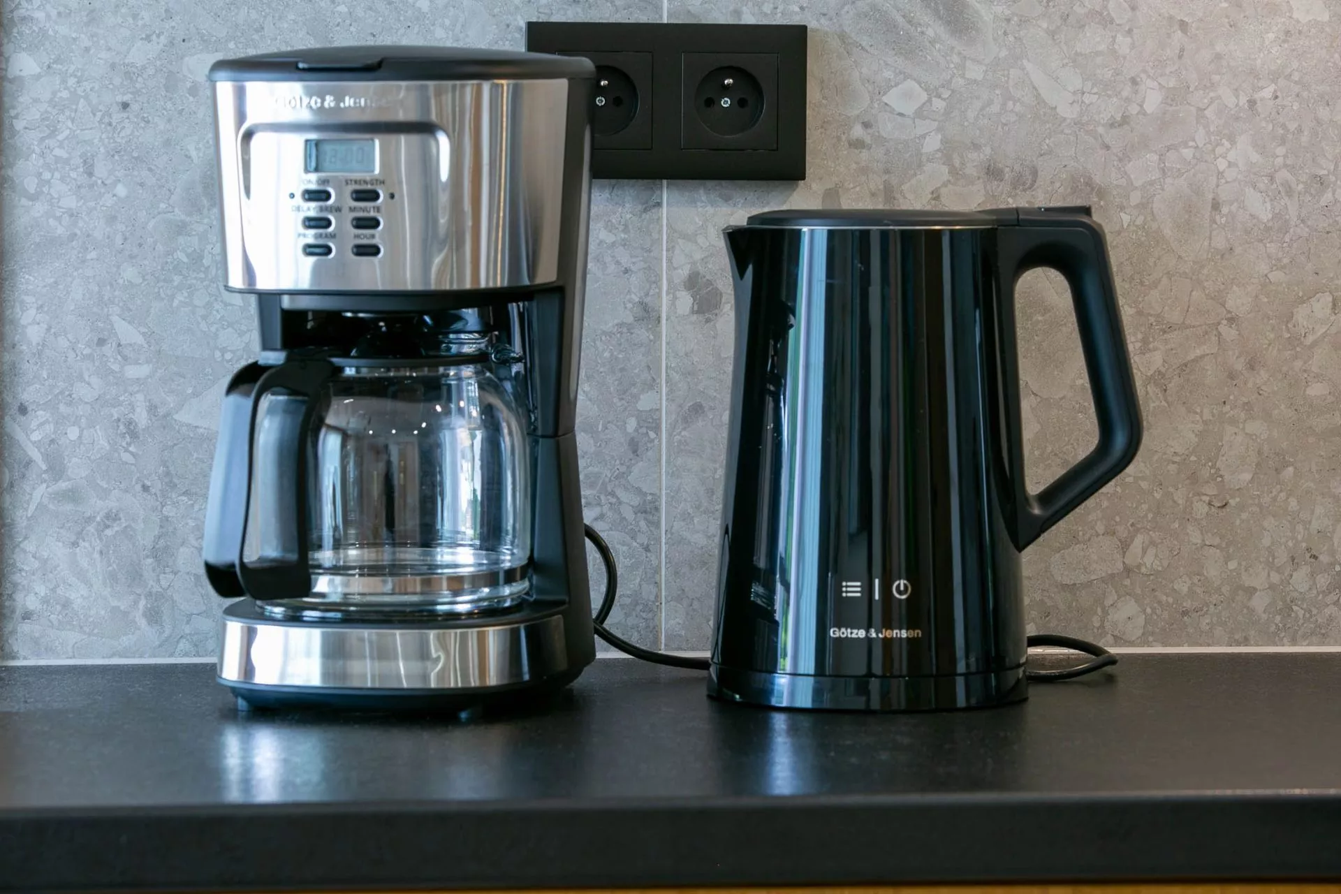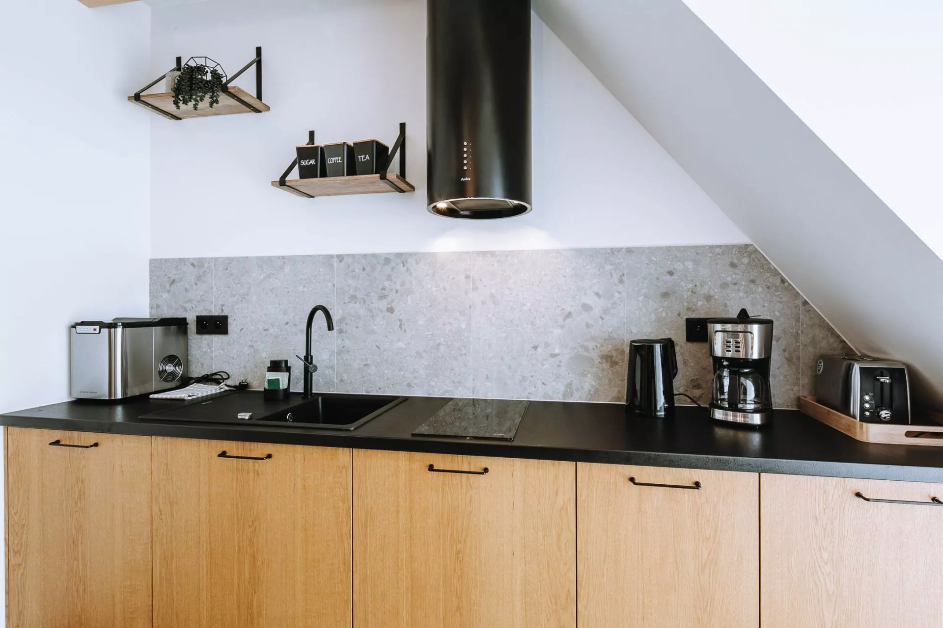 Aneks kuchenny: lodówka, zmywarka, płyta grzewcza 2 palnikowa, czajnik elektryczny, ekspres do kawy przelewowy, kostkarka do lodu, opiekacz, komplet naczyń, garnków, sztućców, zastawa szklana.