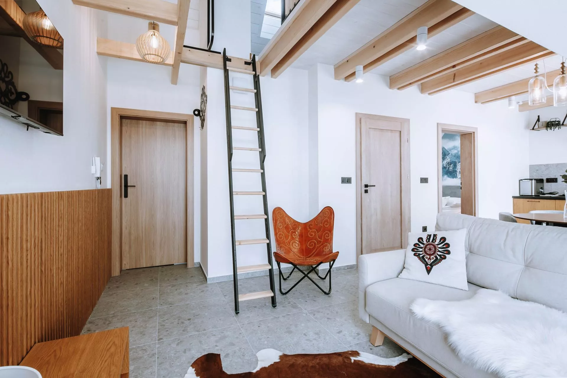 Salon - 2 osobowa rozkładana sofa, fotel, stolik kawowy, 2 szafki typu rtv, TV'45, 2 balkony z widokiem na panoramę Tatr, klimatyzacja.