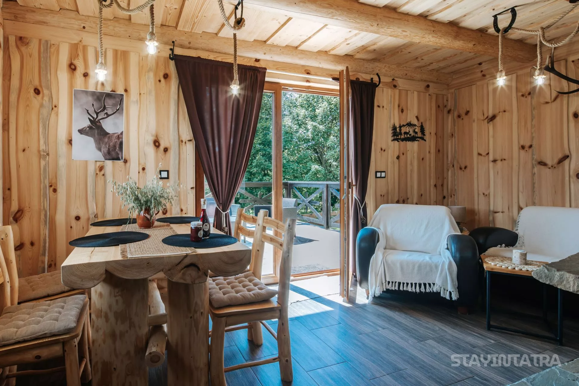 Salon: dwuosobowa rozkładana sofa, TV'50 (kanały telewizji naziemnej), wyjście na taras z którego rozpościera się przepiękny widok na panoramę Tatr, wysoka lada + 2 krzesła