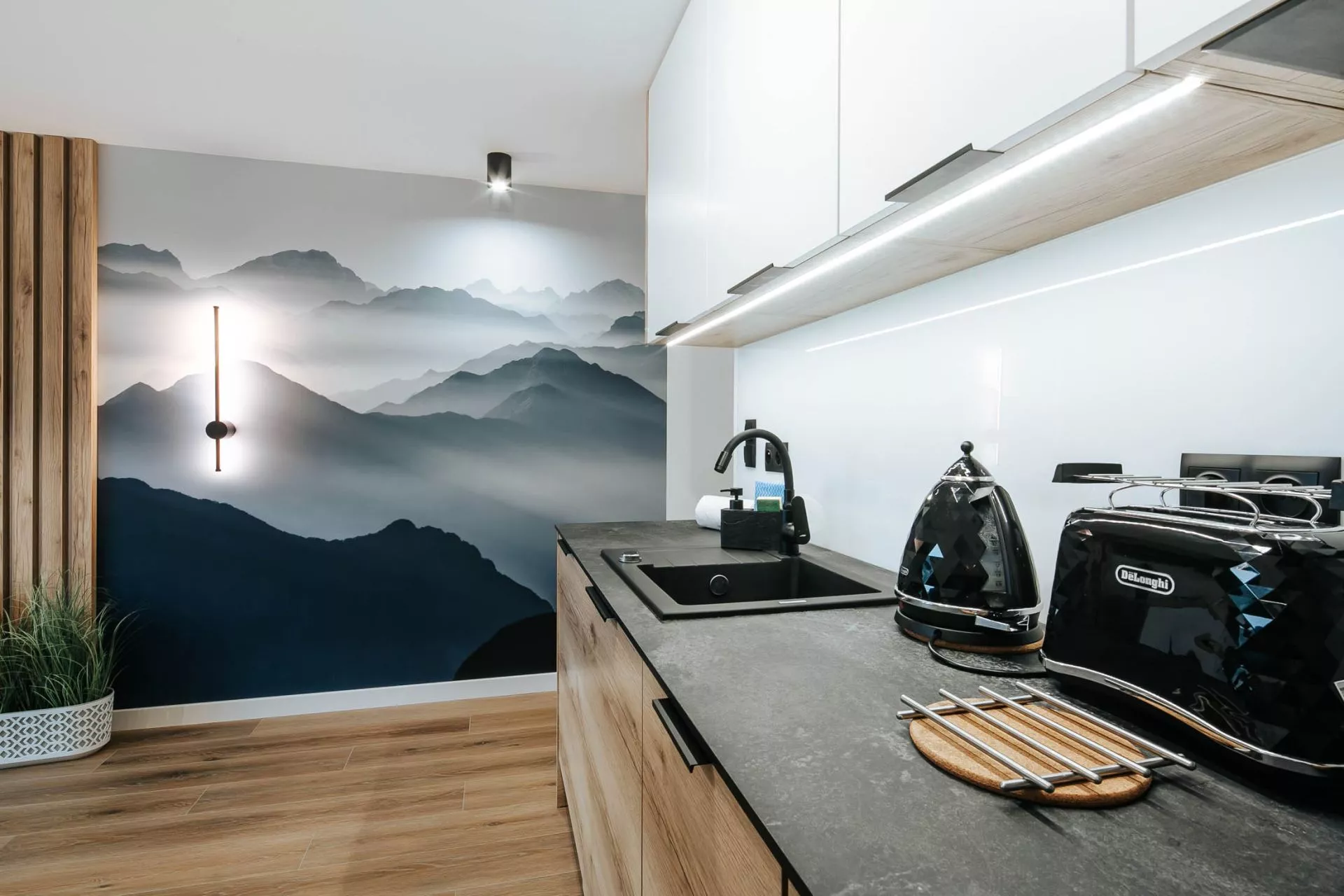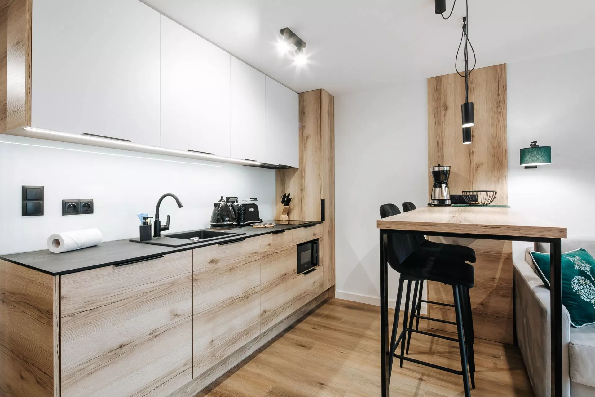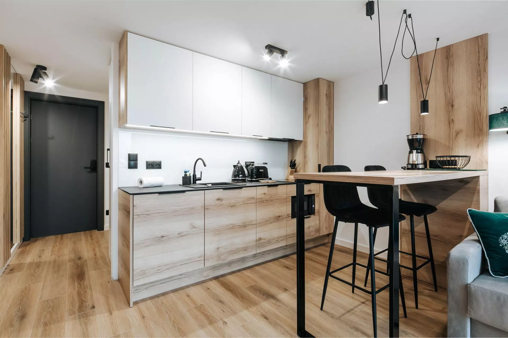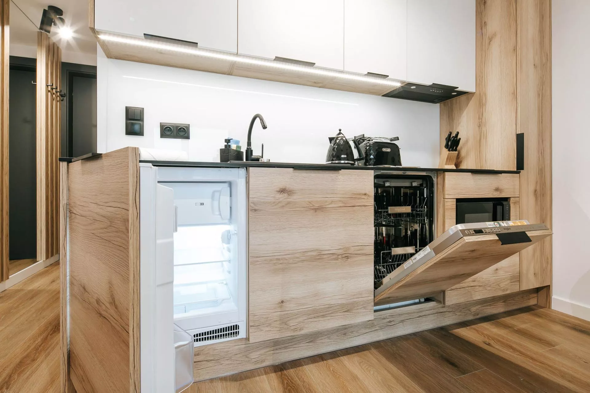 Aneks kuchenny: lodówka, zmywarka, płyta indukcyjna, zlew 1-komorowy, czajnik elektryczny, ekspres do kawy, toster, okap, komplet naczyń, patelnia, akcesoria do gotowania, sztućców, garnków, zastawa szklana