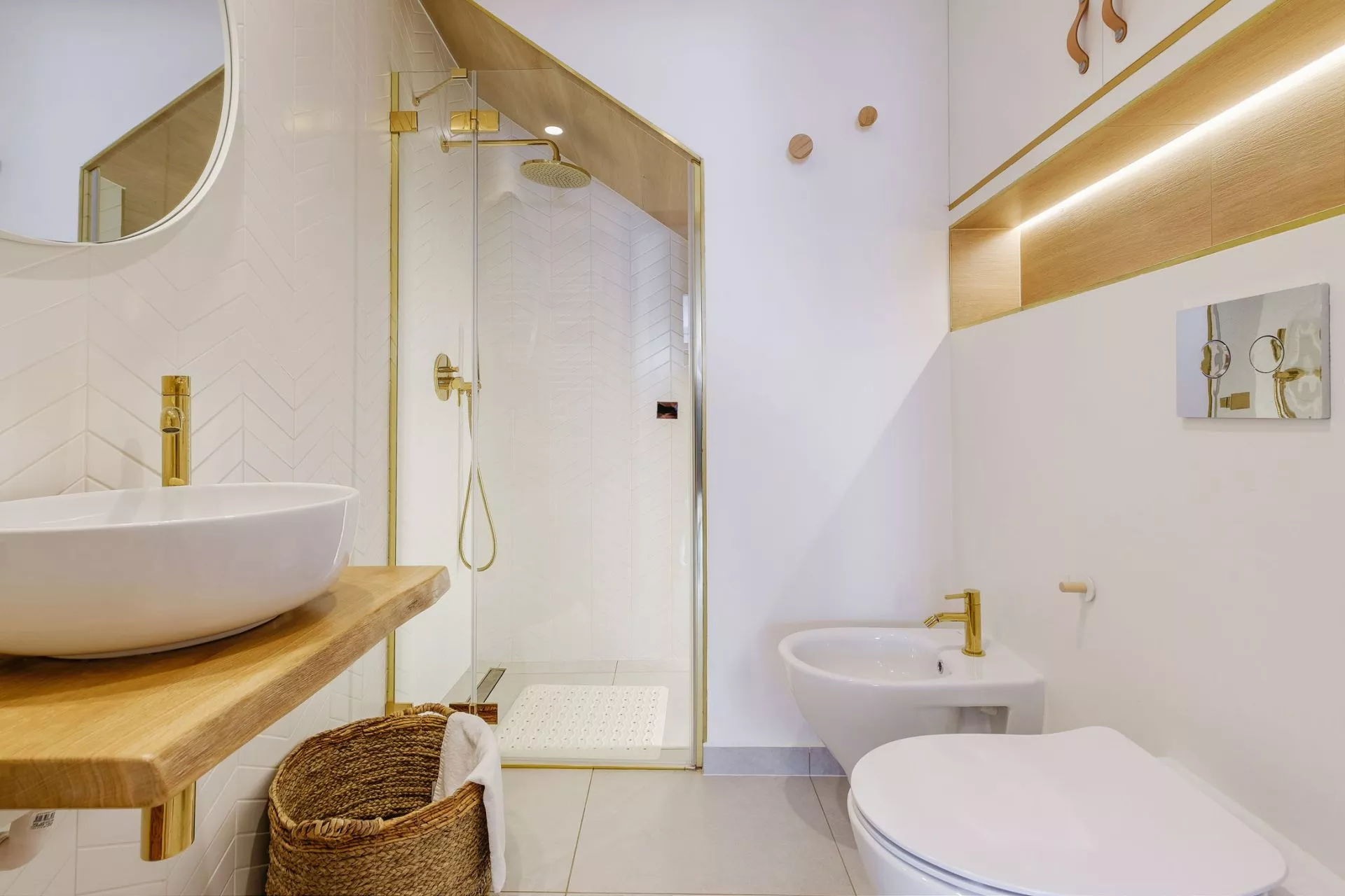 Łazienka: duża kabina prysznicowa, toaleta, bidet, umywalka